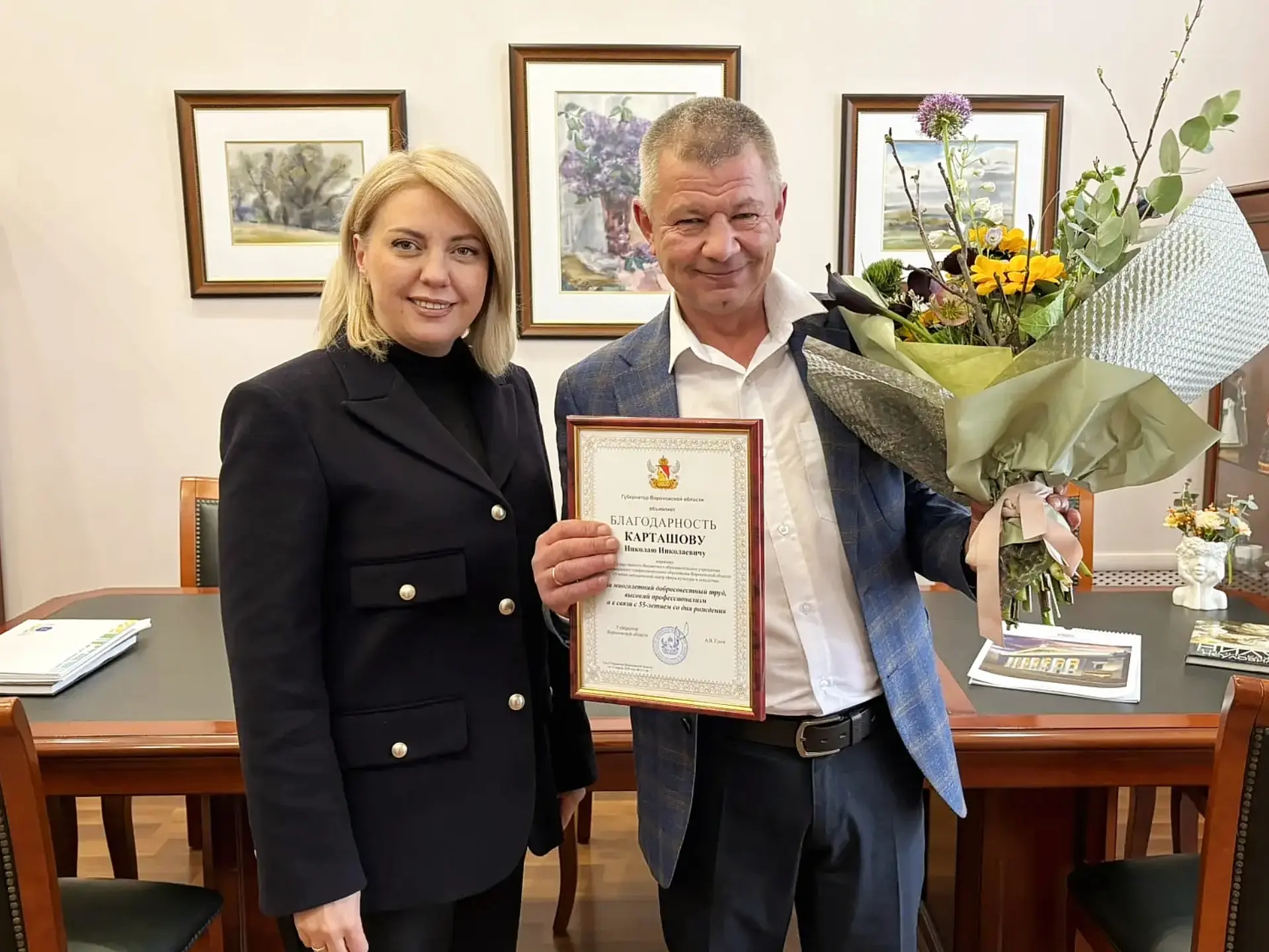 Министр культуры Воронежской области поздравила директора учебно-методического центра сферы культуры и искусства Николая Карташова с юбилеем.