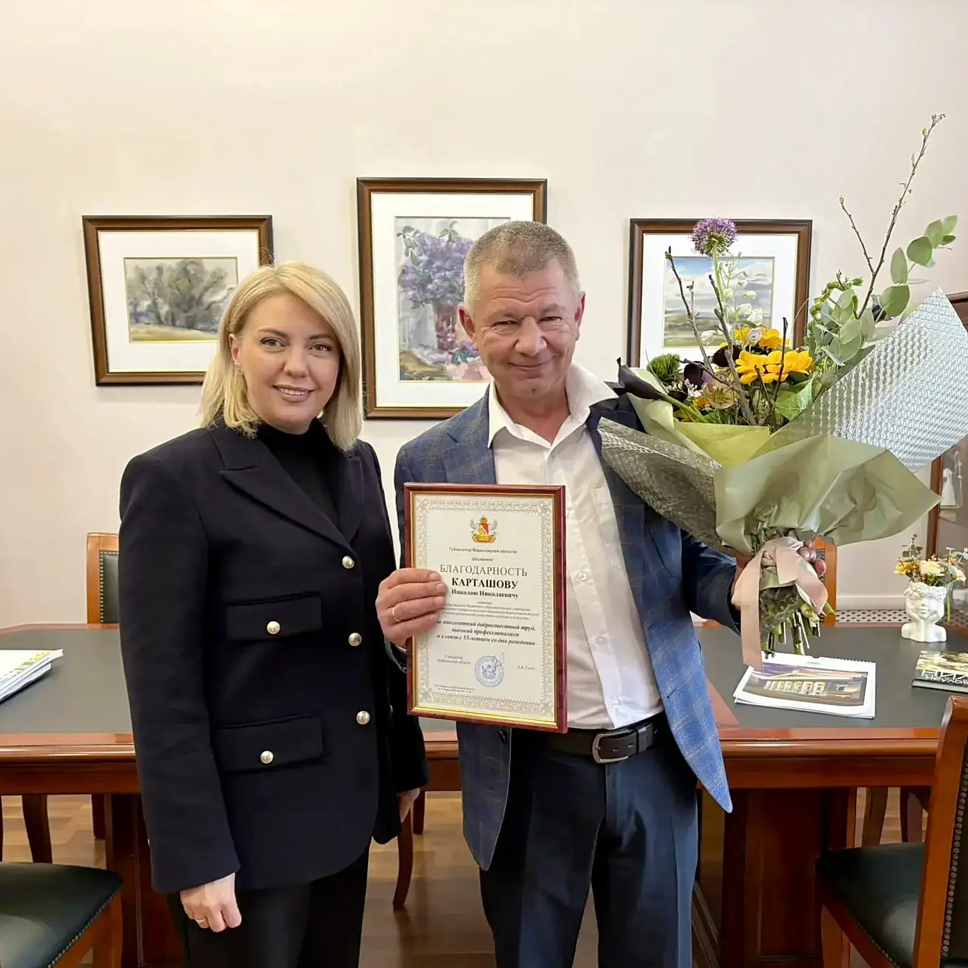 Министр культуры Воронежской области поздравила директора учебно-методического центра сферы культуры и искусства Николая Карташова с юбилеем.