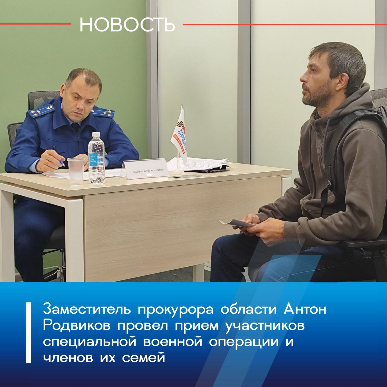 Сегодня, 09 октября 2025 года, заместитель прокурора области Антон Родвиков совместно с представителем военной прокуратуры провел личный прием участников специальной военной операции и членов их семей в филиале Государственного фонда поддержки участников специальной военной операции «Защитники Отечества».