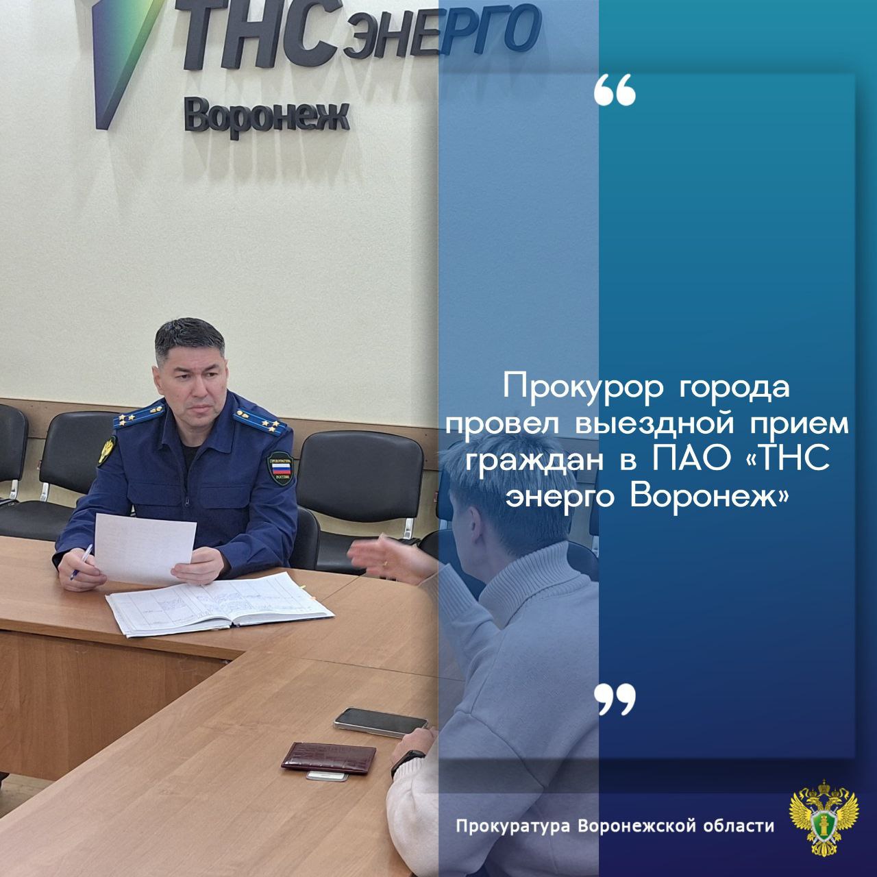 Прокурор города Николай Остапенко провел выездной прием граждан в ПАО «ТНС энерго Воронеж», являющимся крупнейшим предприятием, оказывающим услуги энергоснабжения более 27 тыс. организаций и более 1 млн граждан на территории региона.