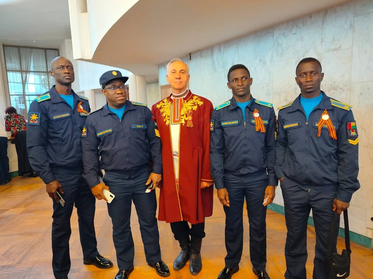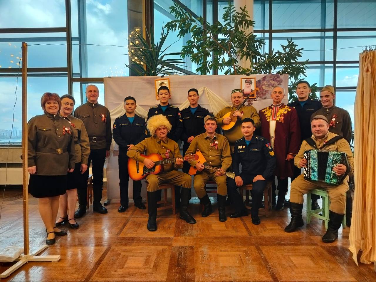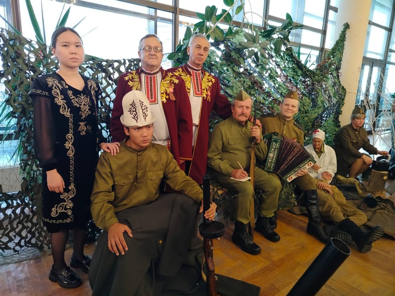 В фойе развернулась локация «Солдатский привал», где потомки победителей в военной форме перенесли гостей в атмосферу фронтовых будней. Звучали песни военных лет - символ единства народов нашей страны.