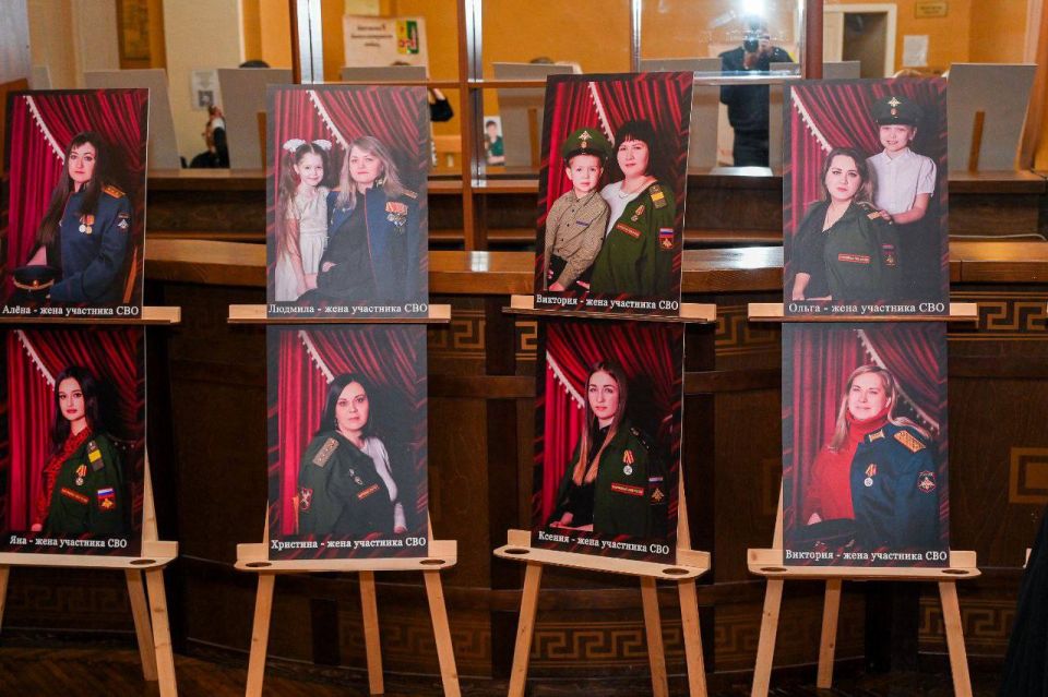 Ключевым моментом мероприятия явилась фотовыставка – проект «Семья Героя». Десятки портретов – отцов с сыновьями, которые служат или служили в зоне СВО. Но большая часть – это жены военнослужащих. На снимках они позируют в кителях своих супругов. Хрупкие внешне, но стойкие внутри. По-другому, говорят, нельзя, ведь от их внутренней силы зависит многое.