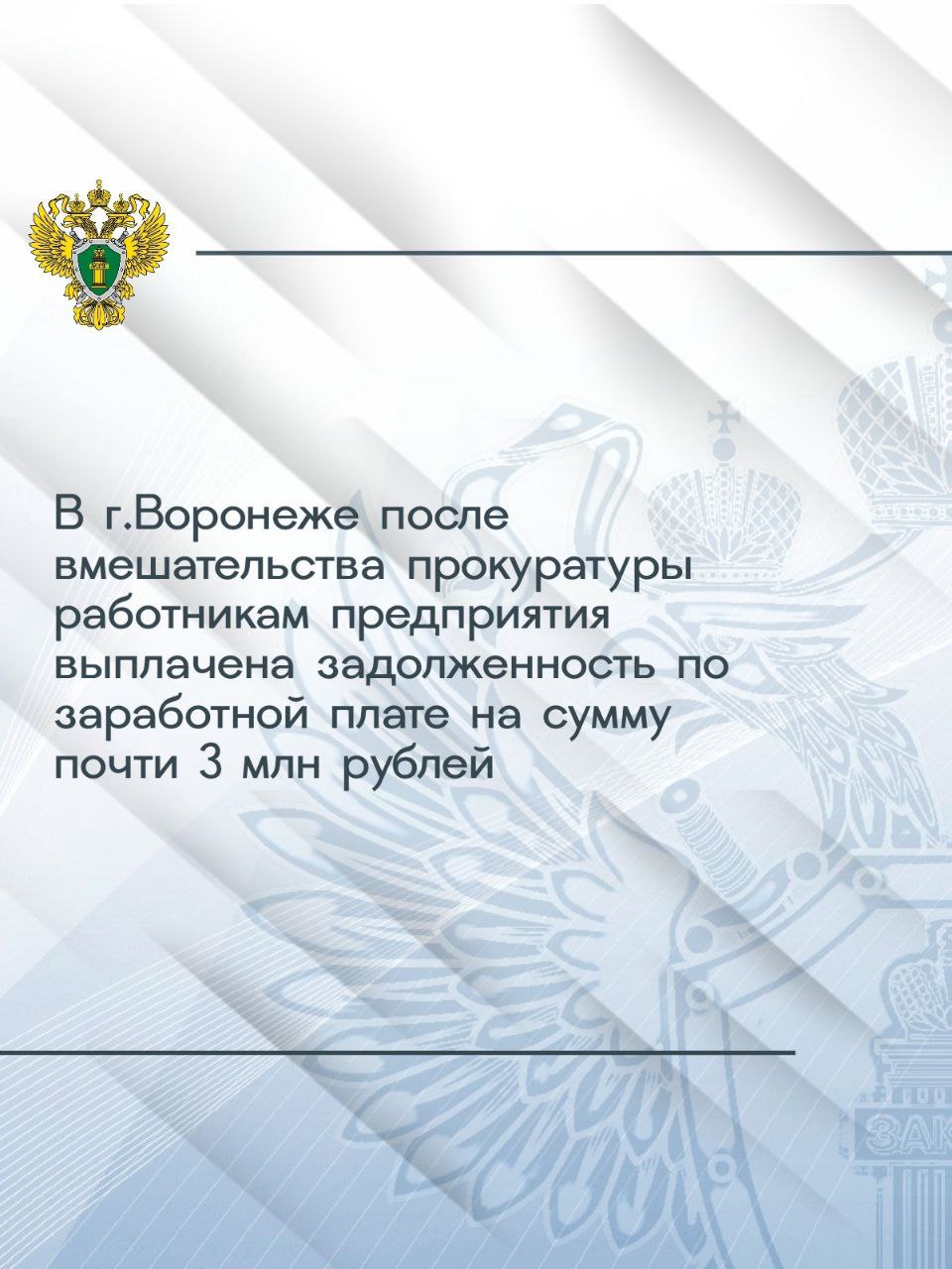 Прокуратура Железнодорожного района города Воронежа предъявила исковые заявления в суд в интересах сотрудников предприятия о взыскании задолженности по заработной плате и компенсации морального вреда на сумму почти 3 млн рублей.