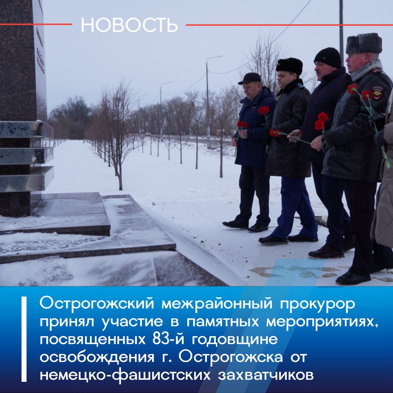 Сегодня, 20 января 2026 года, Острогожский межрайонный прокурор Андрей Новиков принял участие в памятных мероприятиях, посвященных 83-й годовщине освобождения города Острогожска от немецко-фашистских захватчиков