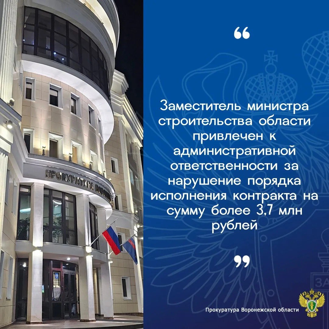 По итогам проверки председатель приемочной комиссии – заместитель министра строительства Воронежской области привлечен к административной ответственности по ч. 7 ст. 7.30.2 КоАП РФ (приемка результатов отдельного этапа исполнения контракта, поставленного товара, выполненной работы или оказанной услуги при несоответствии поставленного товара, выполненной работы или оказанной услуги условиям контракта). Чиновнику назначено наказание в виде штрафа в размере 50 тыс. рублей.