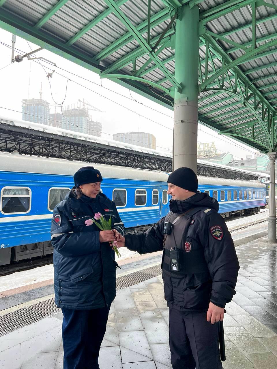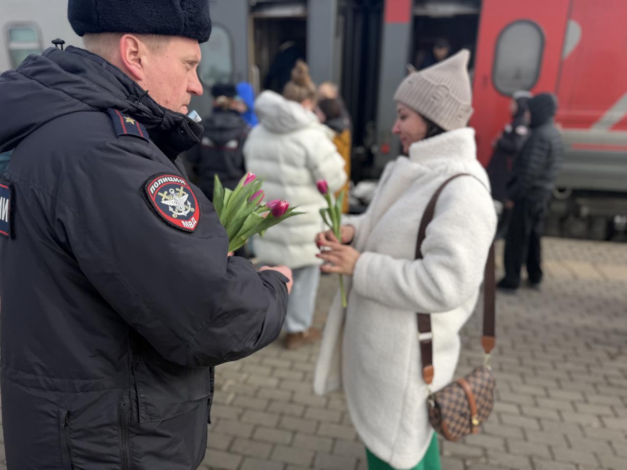 В Белгороде, Ельце, Брянске, Орле и Воронеже стражи правопорядка поздравляют пассажиров ж/д вокзалов, сотрудниц железной дороги и членов поездных бригад с самым прекрасным и нежным праздником!