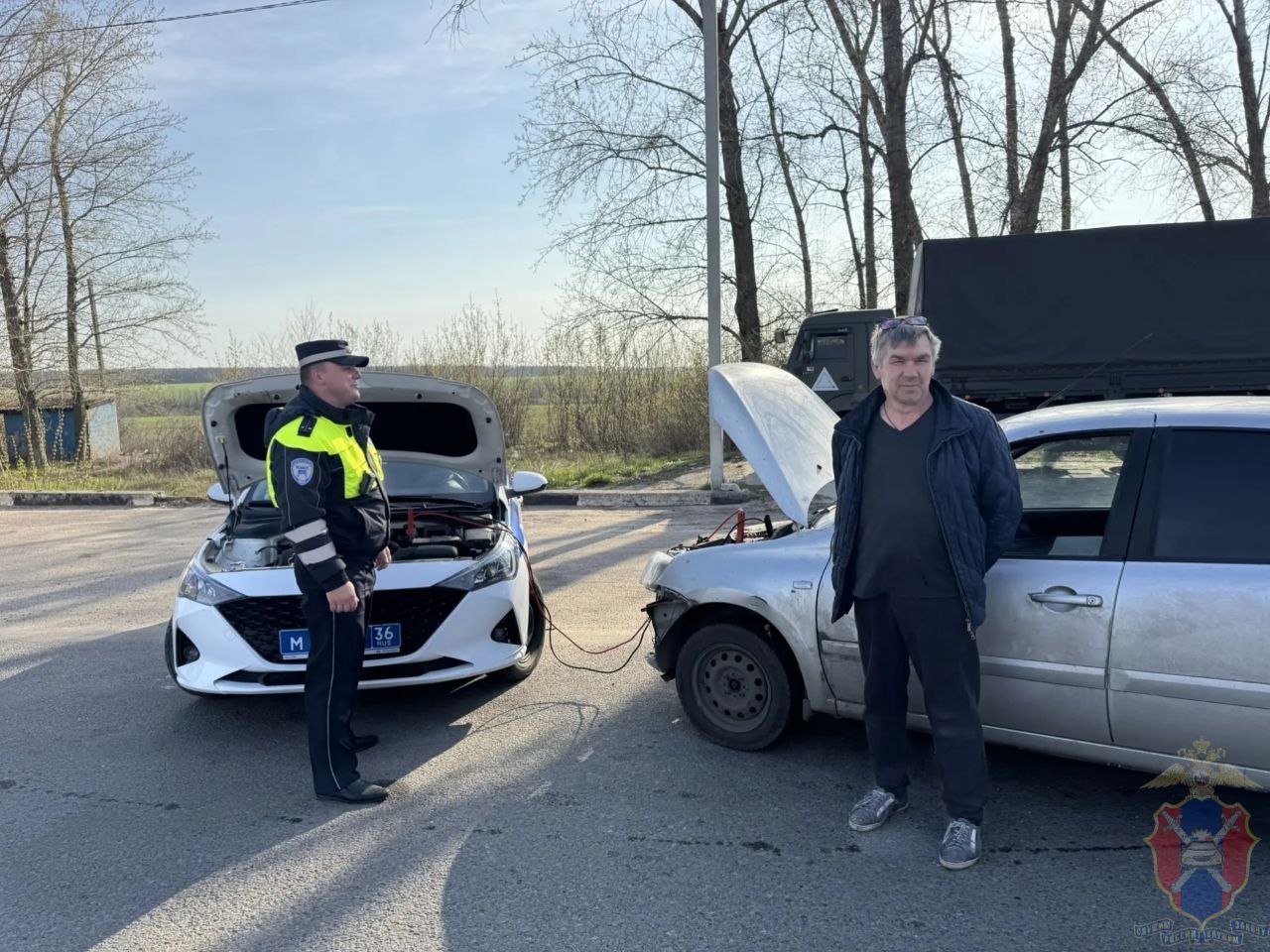Без лишних слов сотрудники оперативно подключили пусковые провода от патрульного автомобиля и запустили двигатель машины.