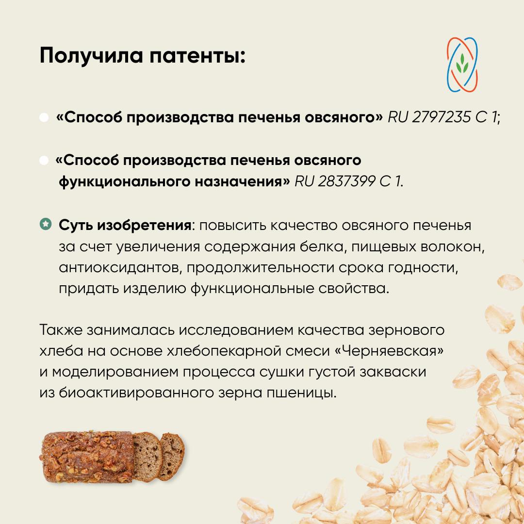 Девушка занимается разработкой технологий для улучшения качества хлебобулочных и кондитерских изделий.