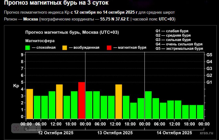 Геомагнитная активность резко возрастет в 21:00. Магнитная буря достигнет уровня G1 (слабая буря). В 0:00 геомагнитная активность также резко снизится. Обстановка останется спокойной до 12:00 понедельника, 13 октября, после, до 15:00, магнитосфера...