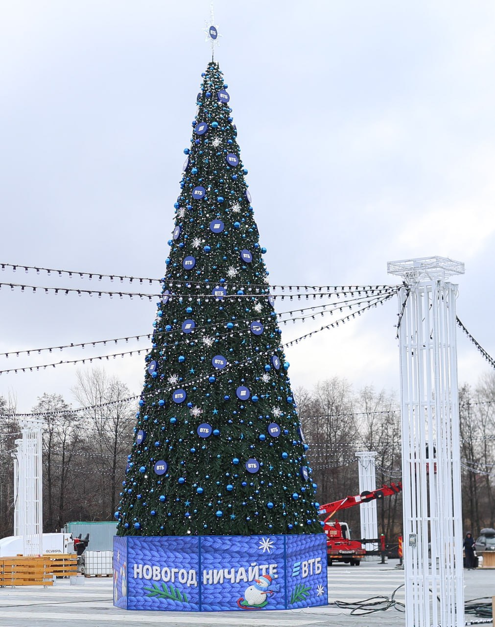 Работы по украшению площадки к новогодним праздникам близятся к финалу. Рабочие уже установили большую 18-метровую искусственную ель, украшенную 745 различными шарами, бантами и световыми элементами. Новогоднюю красавицу поставили на необычный подиум в форме вязаного шарфа с надписью «Новогодничайте».
