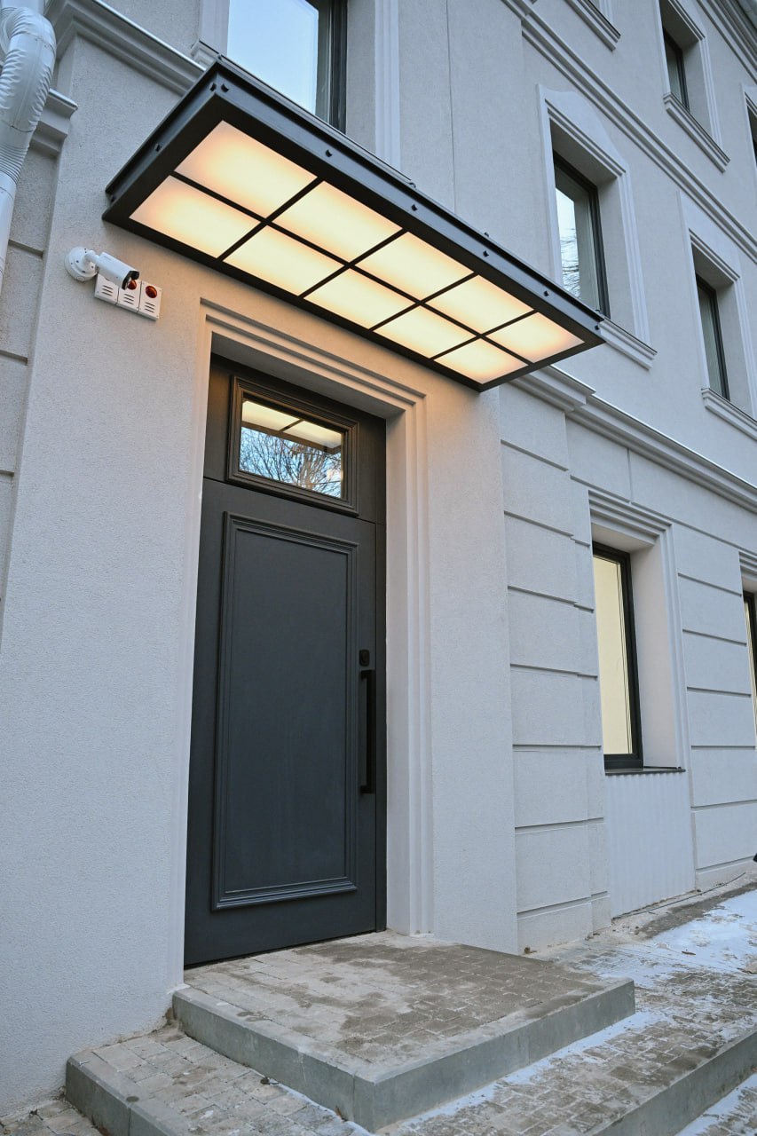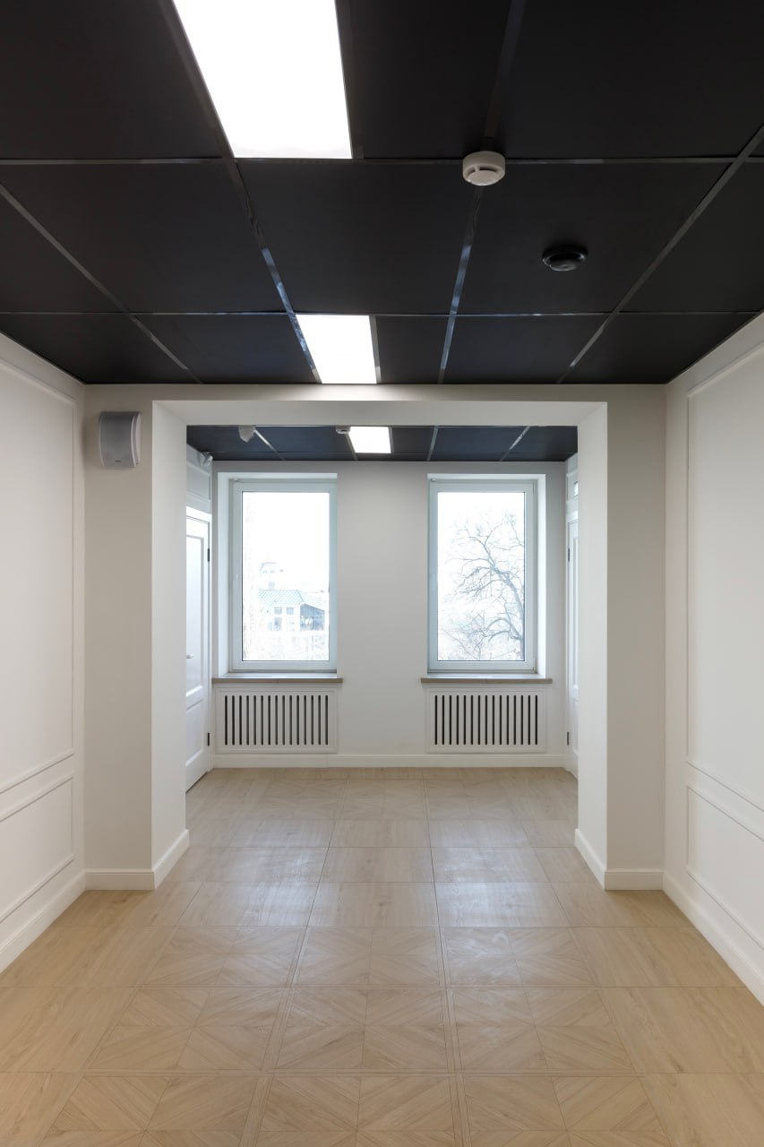 Фасад выполнен в светло-серой штукатурке с рустовкой, карнизами и барельефами на первом этаже. Интерьеры оформлены в черно-белой гамме с добавлением деревянных текстур. В рамках капремонта демонтированы стены, заменены двери и обновлены коммуникации. Установлена пожарная сигнализация и выполнена отделка.