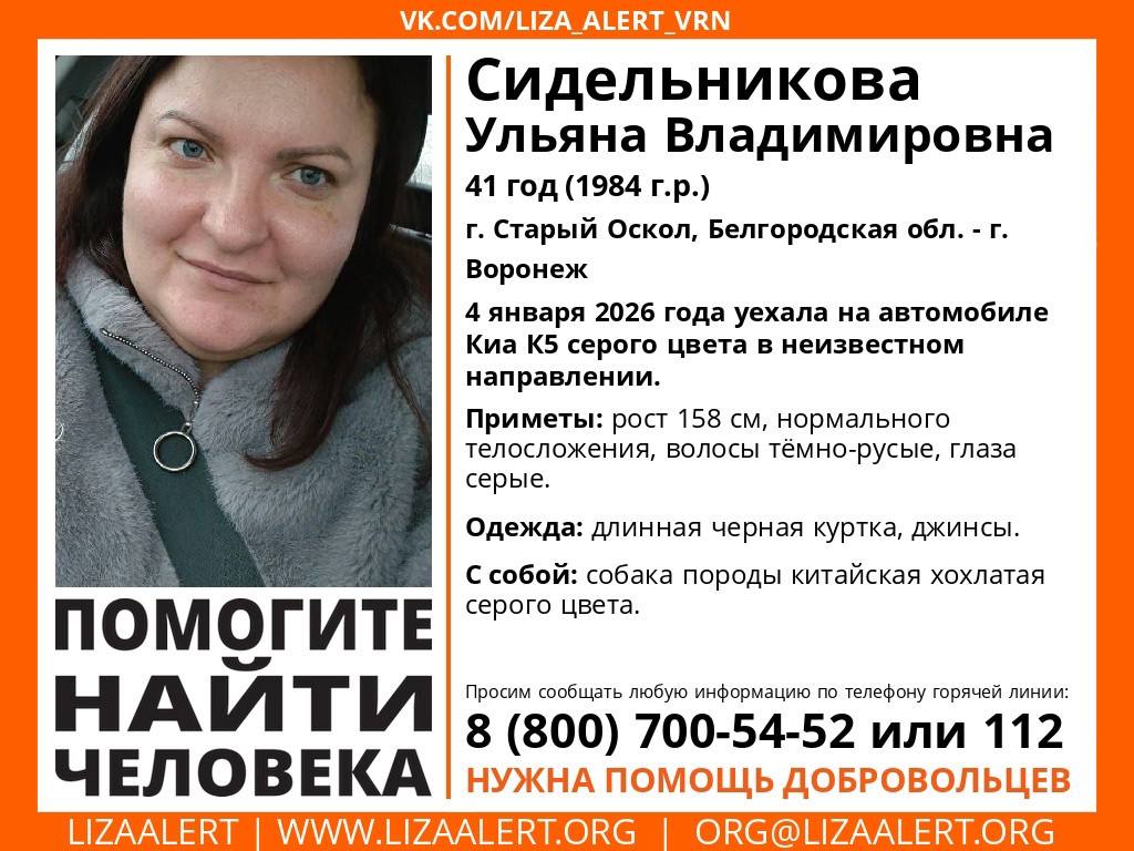 Известно, что женщина 4 января уехала на Kia K5 серого цвета в неизвестном направлении. Ее приметы: рост – 158 см, нормальное телосложение, темно-русые волосы и серые глаза. В день исчезновения она была одета в длинную черную куртку и джинсы. Может находиться в Воронеже.