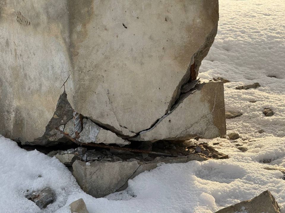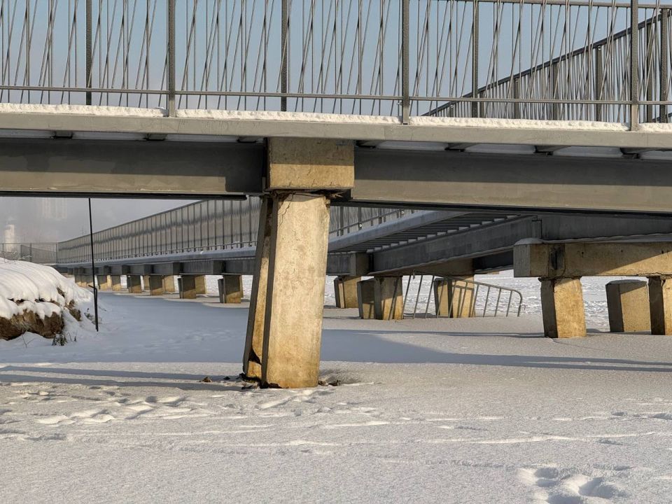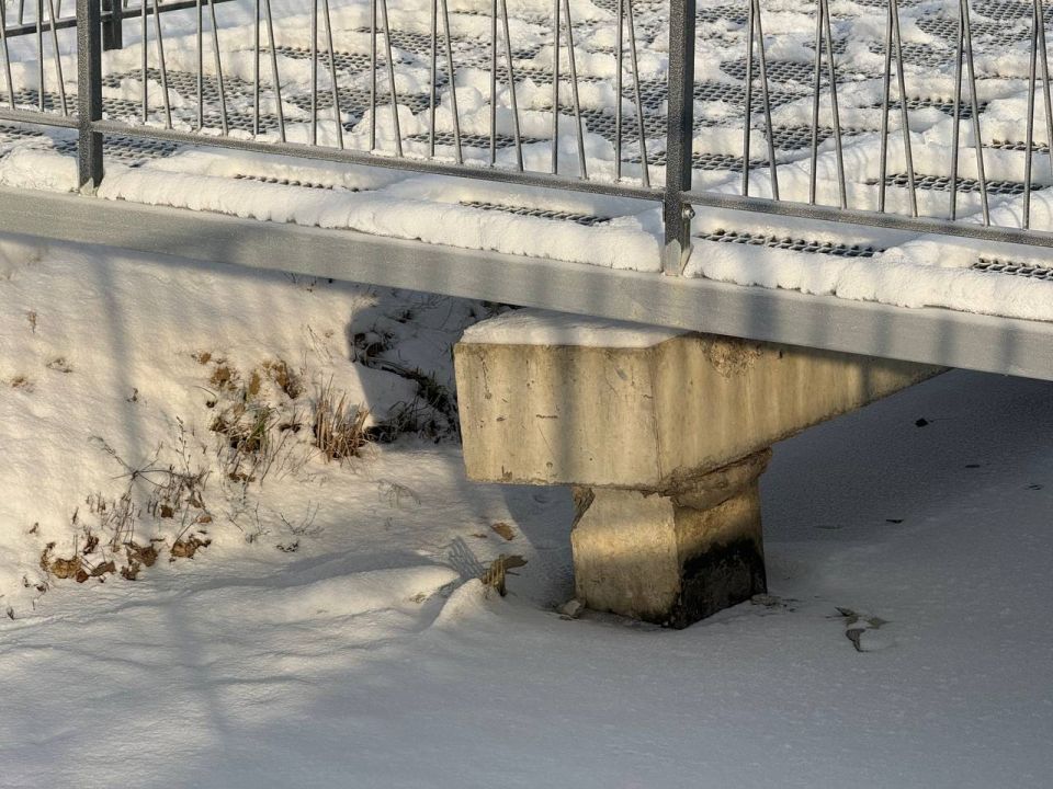 Оказалось, что опоры, на которых держится мост – разрушаются. И выглядит это весьма устрашающее. Железобетонные сваи потрескались и покосились. Из некоторых уже торчит арматура. Складывается впечатление, что сейчас опоры удерживает только лед водохранилища. Что будет, когда он растает – неясно.
