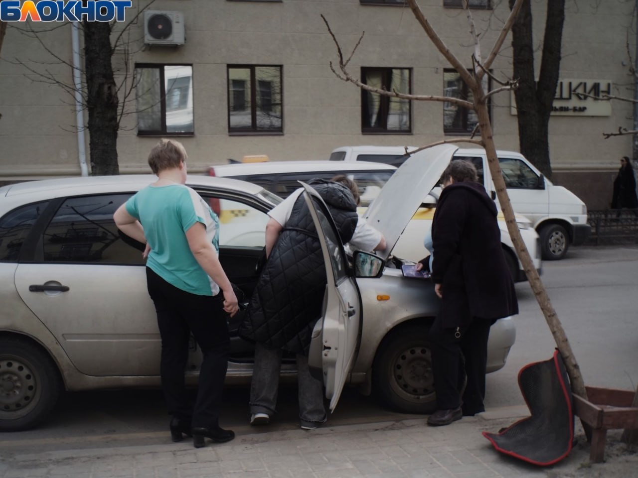 В объектив попали случайные прохожие: молодые люди в наушниках, пенсионеры за шахматами, женщины, чинящие автомобиль.