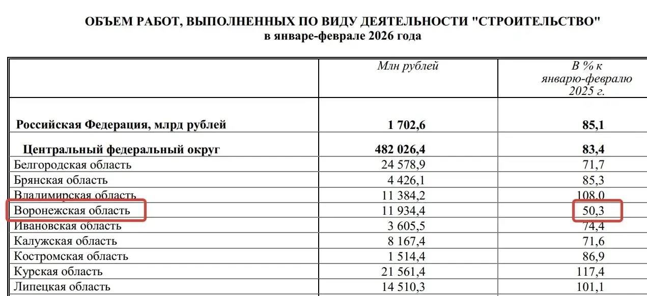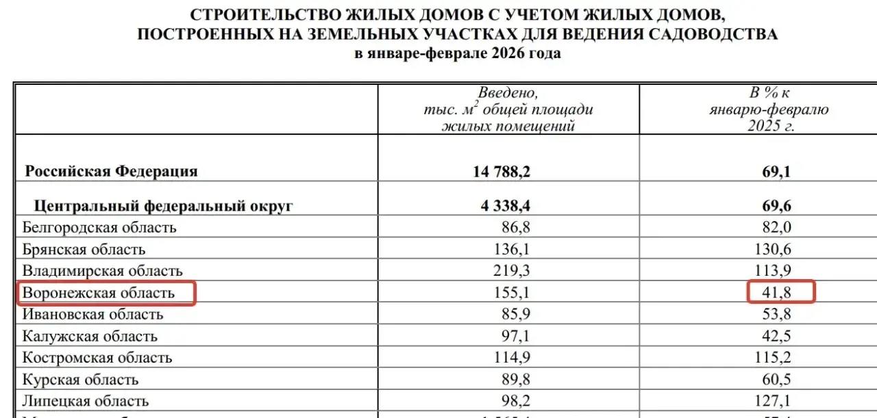 Воронежская область установила антирекорд по строительству. Строительство жилья за первые два месяца 2026 года уменьшилось на 58,2% (по сравнению с таким же периодом 2025 года) и составило 155 тыс кв м.