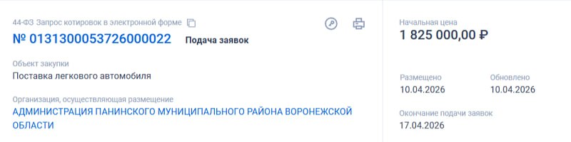На платформе Госзакупок появился тендер на поставку легкового автомобиля, размещенный администрацией Панинского района Воронежской области. Начальная цена закупки – 1 млн 825 тысяч рублей.