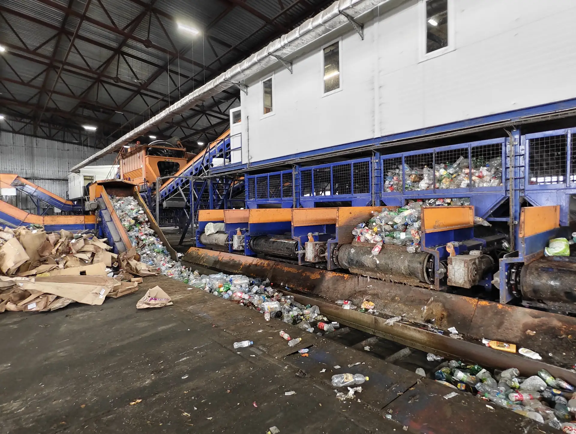 С помощью мощных фронтальных погрузчиков отходы попадают на транспортёры, а затем — в сортировочное отделение. Там специальные линии отбирают полезные фракции: картон, пластик, стекло, металл.