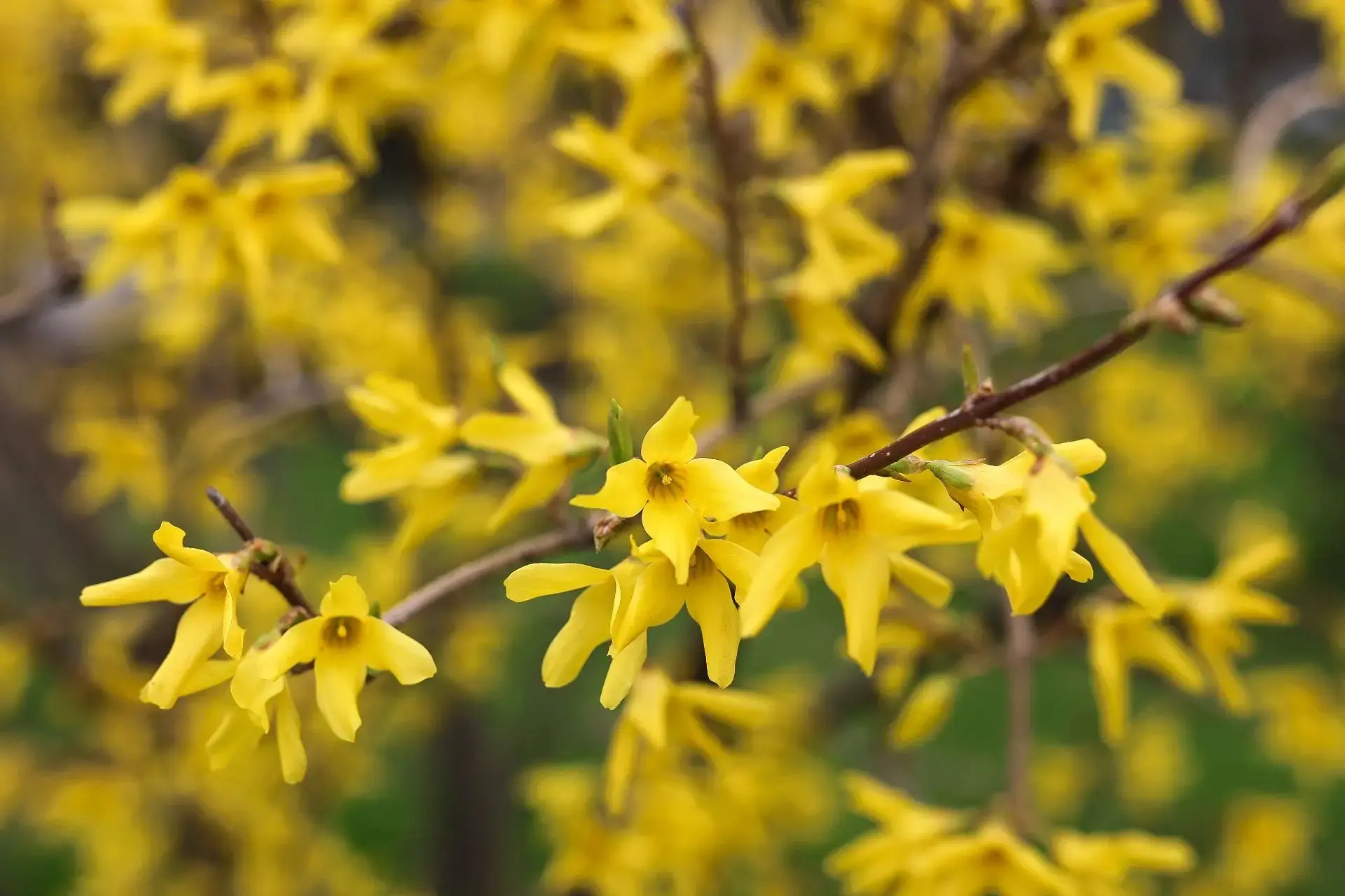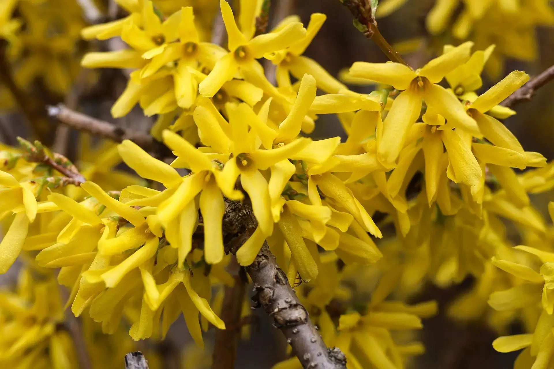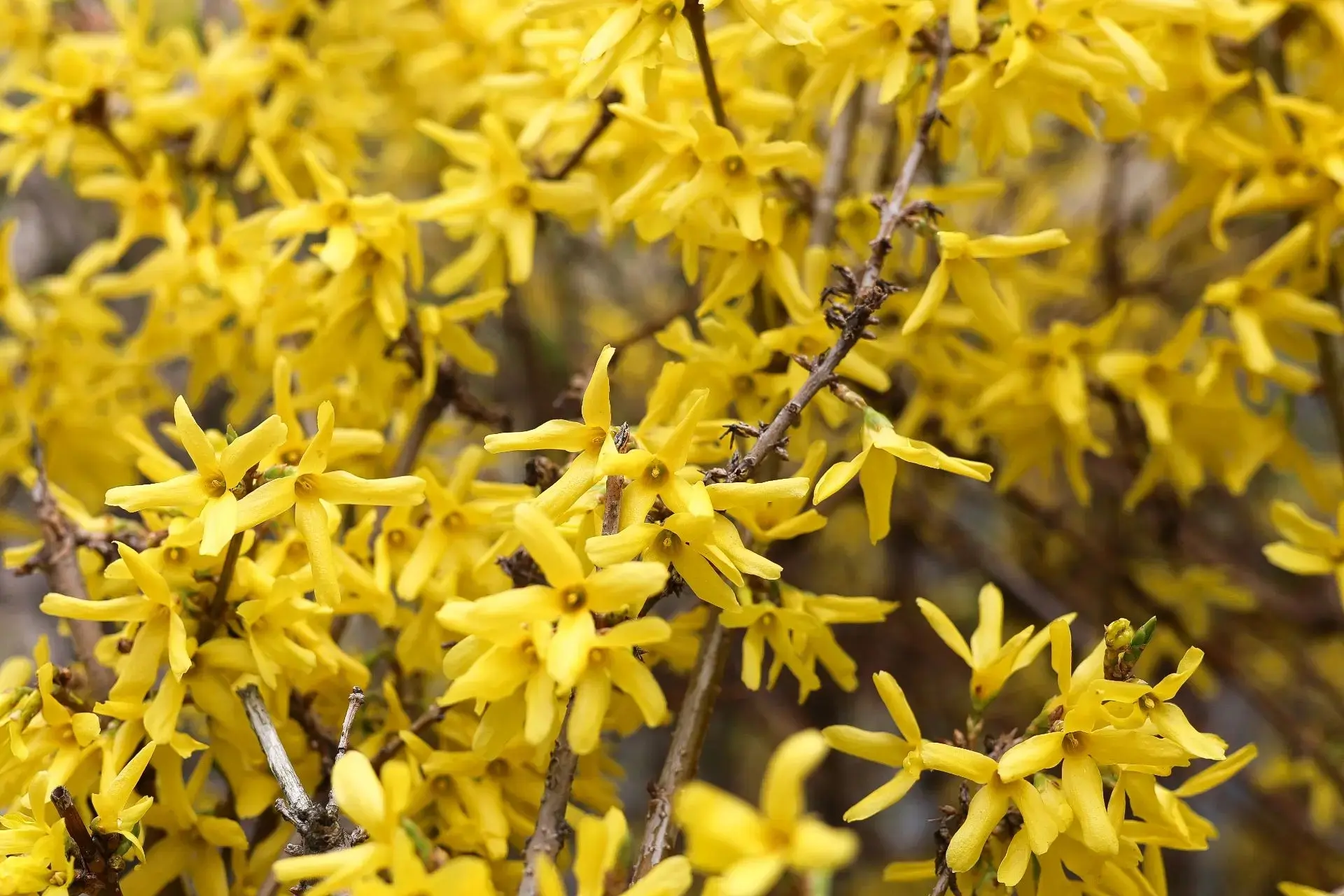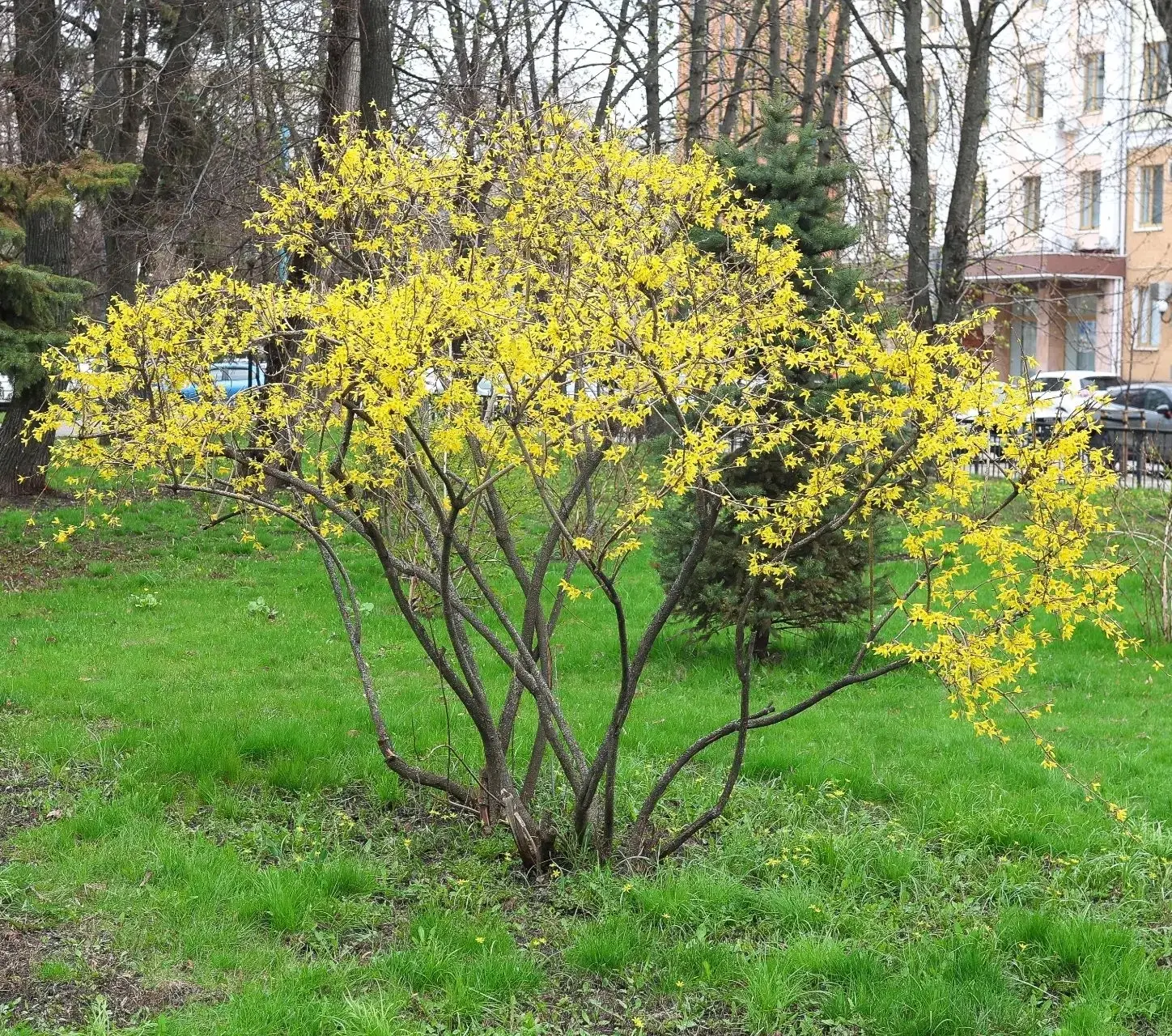В пасмурную погоду форзиция в парках, как солнышко. Ярко-золотистые колокольчатые цветки с четырьмя лепестками распускаются раньше листвы, придавая особую привлекательность кустарнику. Цветение длится около 3-4 недель.