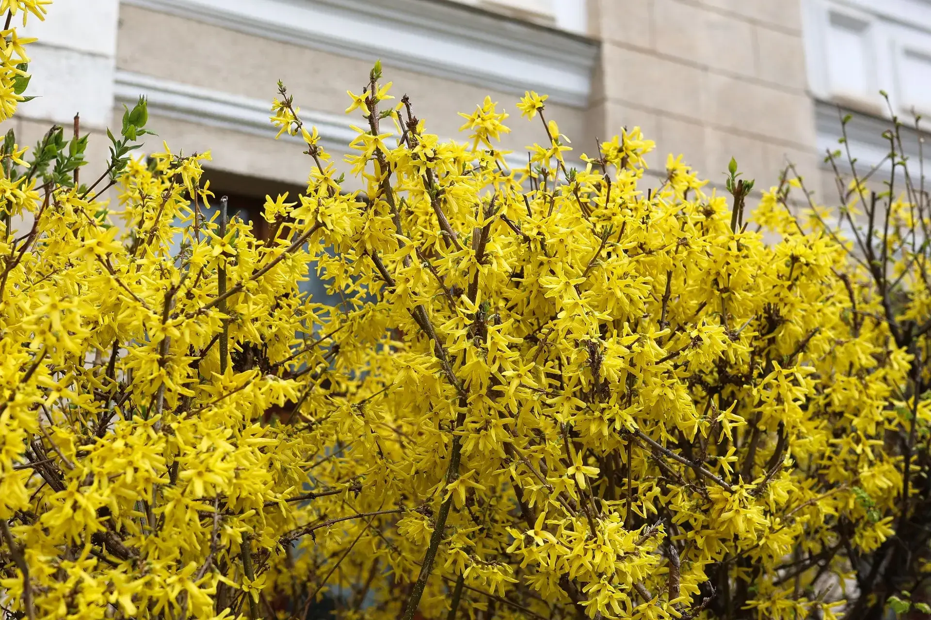 Скверы «Надежда» и «Дзержинского» украшает пышное цветение форзиции, а улицы зеленеют молодыми листьями деревьев.