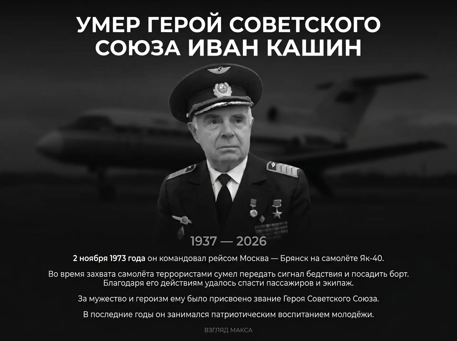В Брянске на 90-м году жизни умер Герой Советского Союза Иван Кашин — легендарный советский летчик. О смерти Ивана Андреевича 20 апреля сообщили власти Брянской области. В последние годы он активно занимался патриотическим воспитанием молодежи и участвовал в общественной жизни региона.