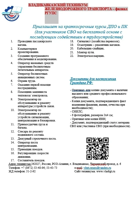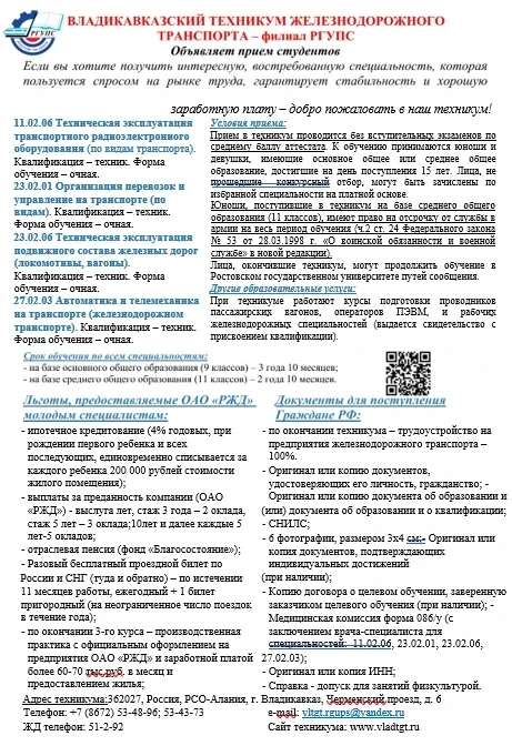 Уважаемые родители выпускников 9,11 классов! Информируем вас, что ВЛАДИКАВКАЗСКИЙ ТЕХНИКУМ ЖЕЛЕЗНОДОРОЖНОГО ТРАНСПОРТА – филиал РГУПС, объявляет набор студентов.