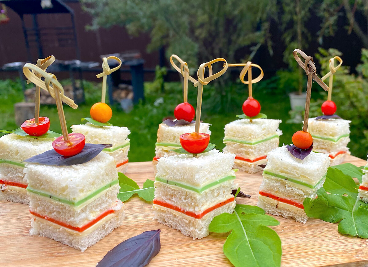 Для выездного пикника или шашлыков мини-бутерброды будут замечательной закуской. На свежем воздухе аппетит совершенно другой, и, особенно среди детей, такие закуски быстро исчезнут с тарелок.