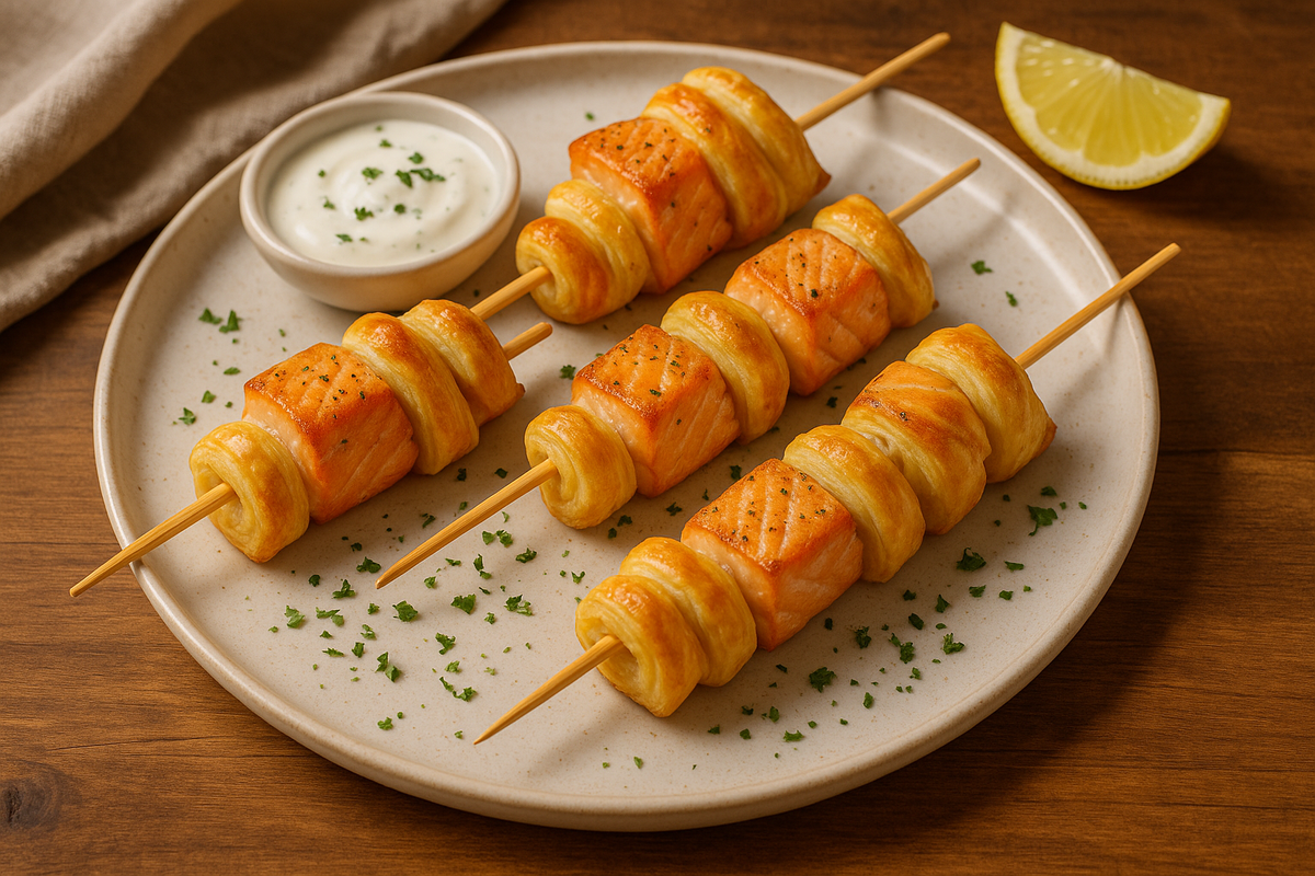 - Мини-шашлычки из лосося в слоёном тесте. Нежные кусочки лосося, завернутые в слоёное тесто, создадут великолепную закуску для вашего стола. Сочетание с йогуртовым соусом придаст им изюминку.