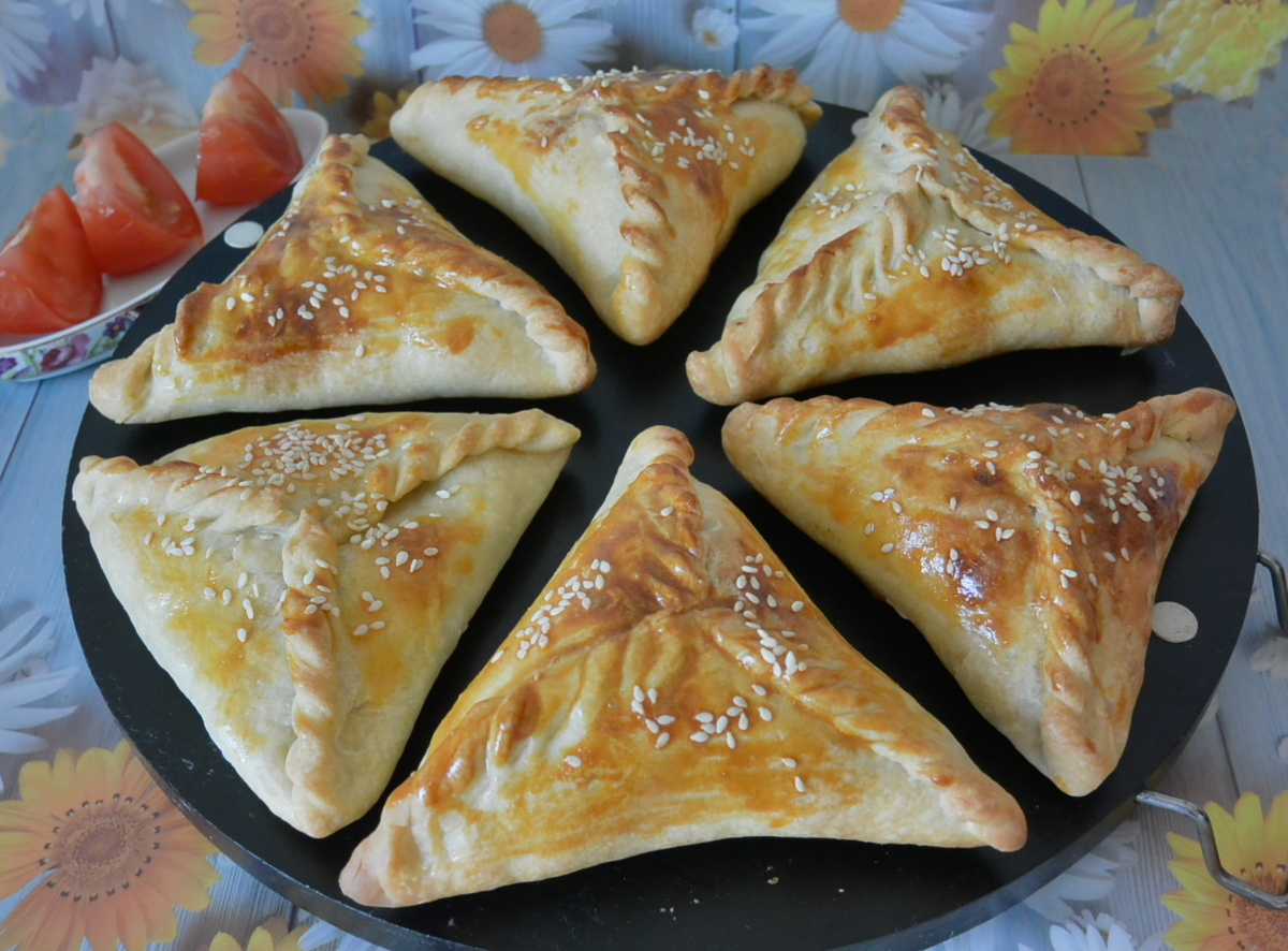 Параллельно готовится тесто, в которое входят маргарин, сметана и сахар. После замеса тесто делят на небольшие кусочки и раскатывают в круглые лепешки.