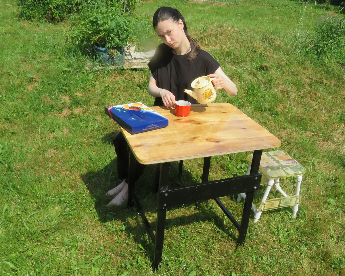 Основной вопрос — из чего сделать столешницу. Первоначально рассматривался вариант с фанерой, которую можно было бы украсить, опираясь на стиль табуреток. Однако, поиски идеального материала — фанеры экстра сорта — оказались безуспешными. Обращаясь в строительные магазины, приходилось сталкиваться с довольно низким качеством предлагаемых материалов. В результате выбор пал на лист фанеры, даже несмотря на его дефекты, которые придавали ему интересный внешний вид.