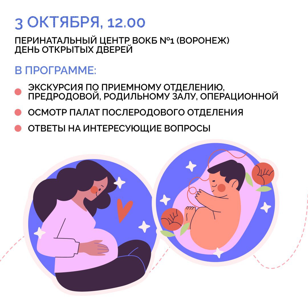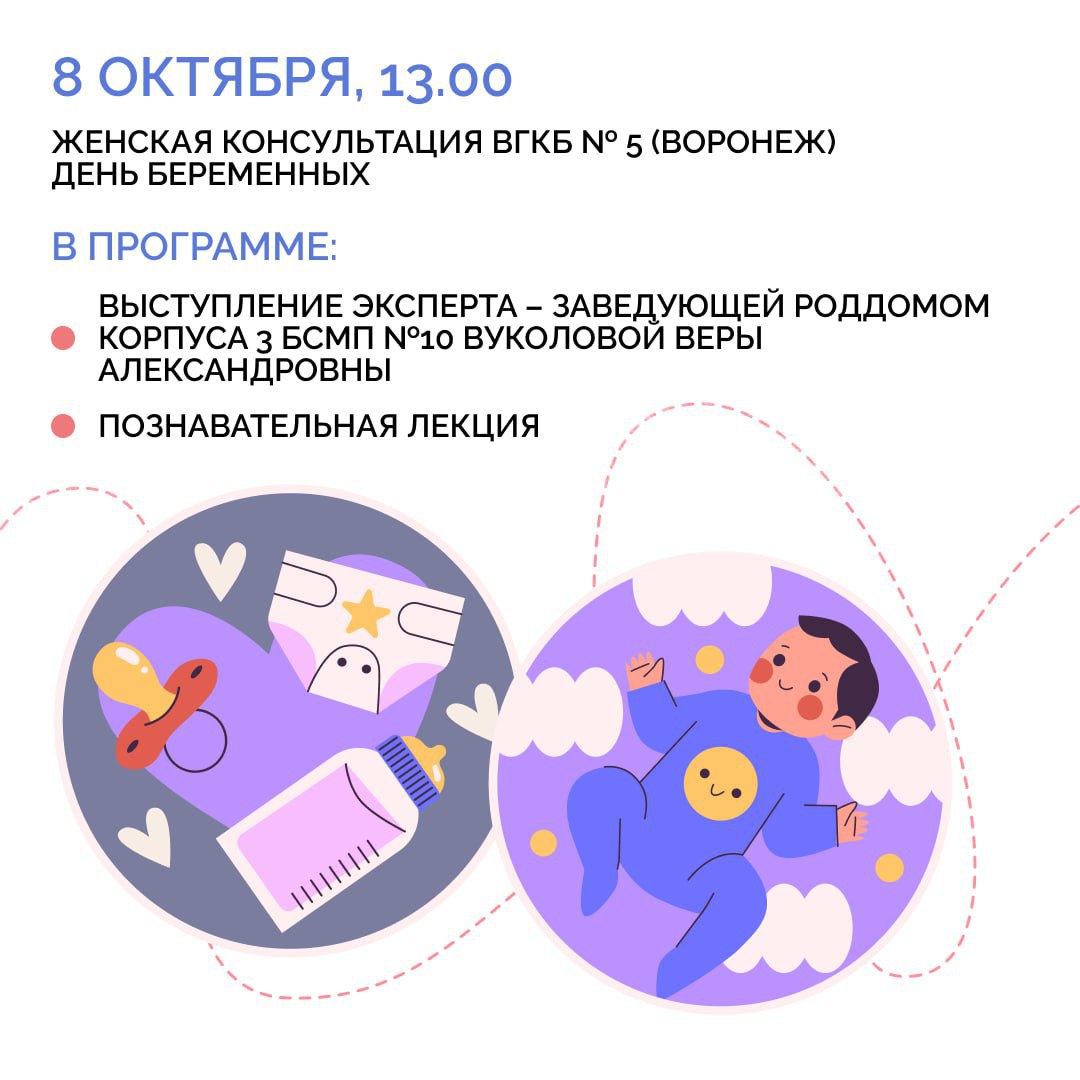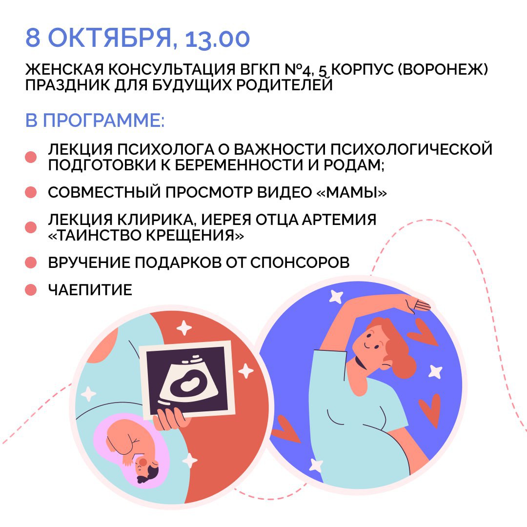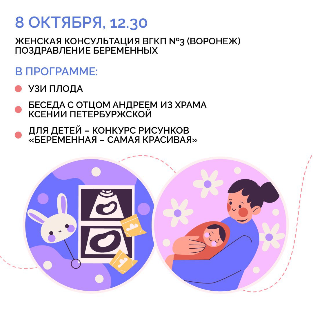 7 октября в России празднуют День беременных. В честь этого воронежские медицинские учреждения региона проведут ряд мероприятий, посвященных теме материнства, отцовства, семьи и поддержки беременных. Для будущих мам подготовили экскурсии, лекции психологов, круглые столы, вручение подарков. Подробнее – в наших карточках.