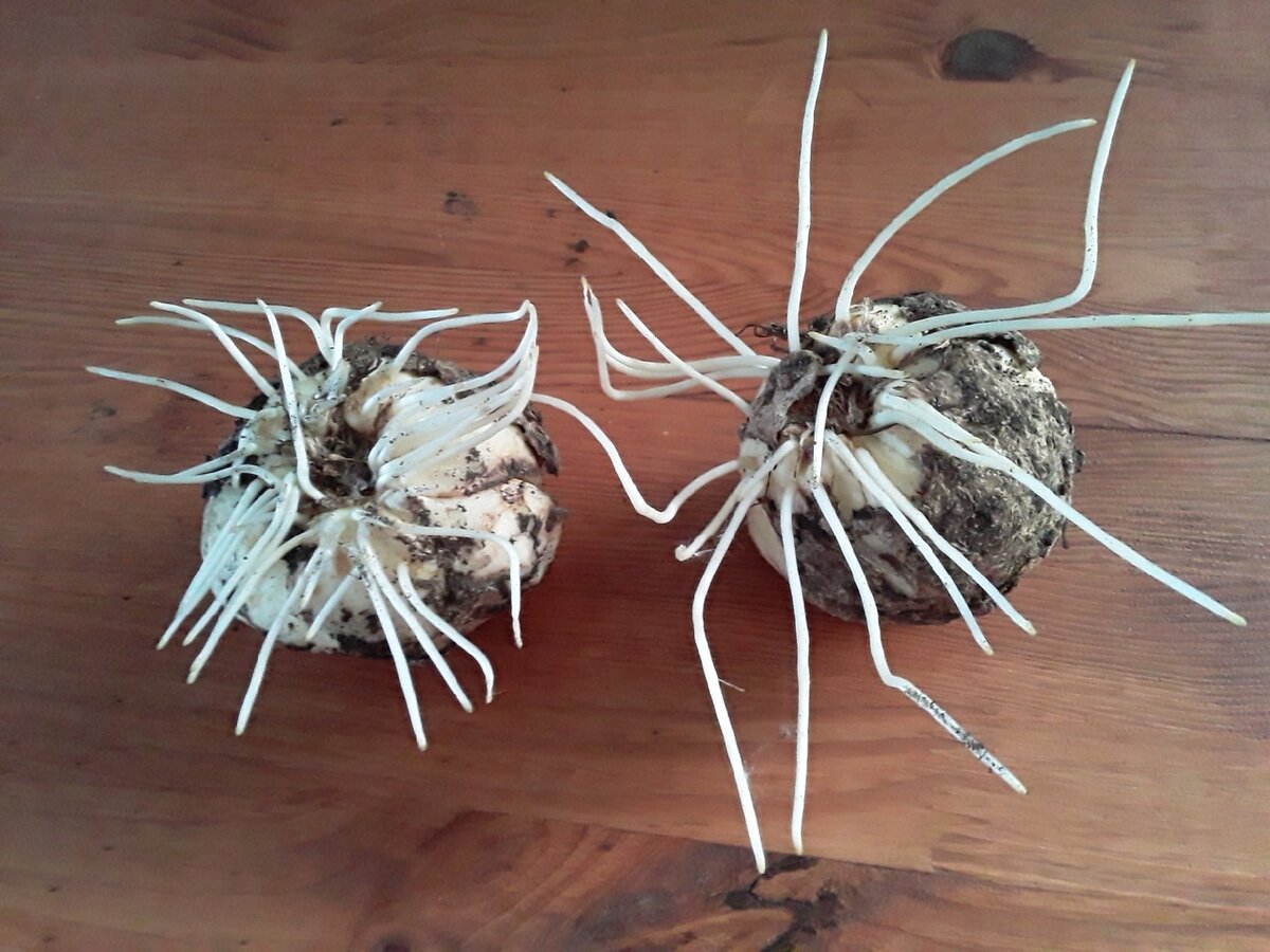 Во время выкопки одной из луковиц произошел неприятный инцидент – она была случайно повреждена. Специалисты советовали выбросить её, но желание попробовать вырастить новую луковицу было сильнее. К удивлению, поврежденная луковица успела зарубцеваться и даже выпустить корешки, что даёт шанс на успешное восстановление.