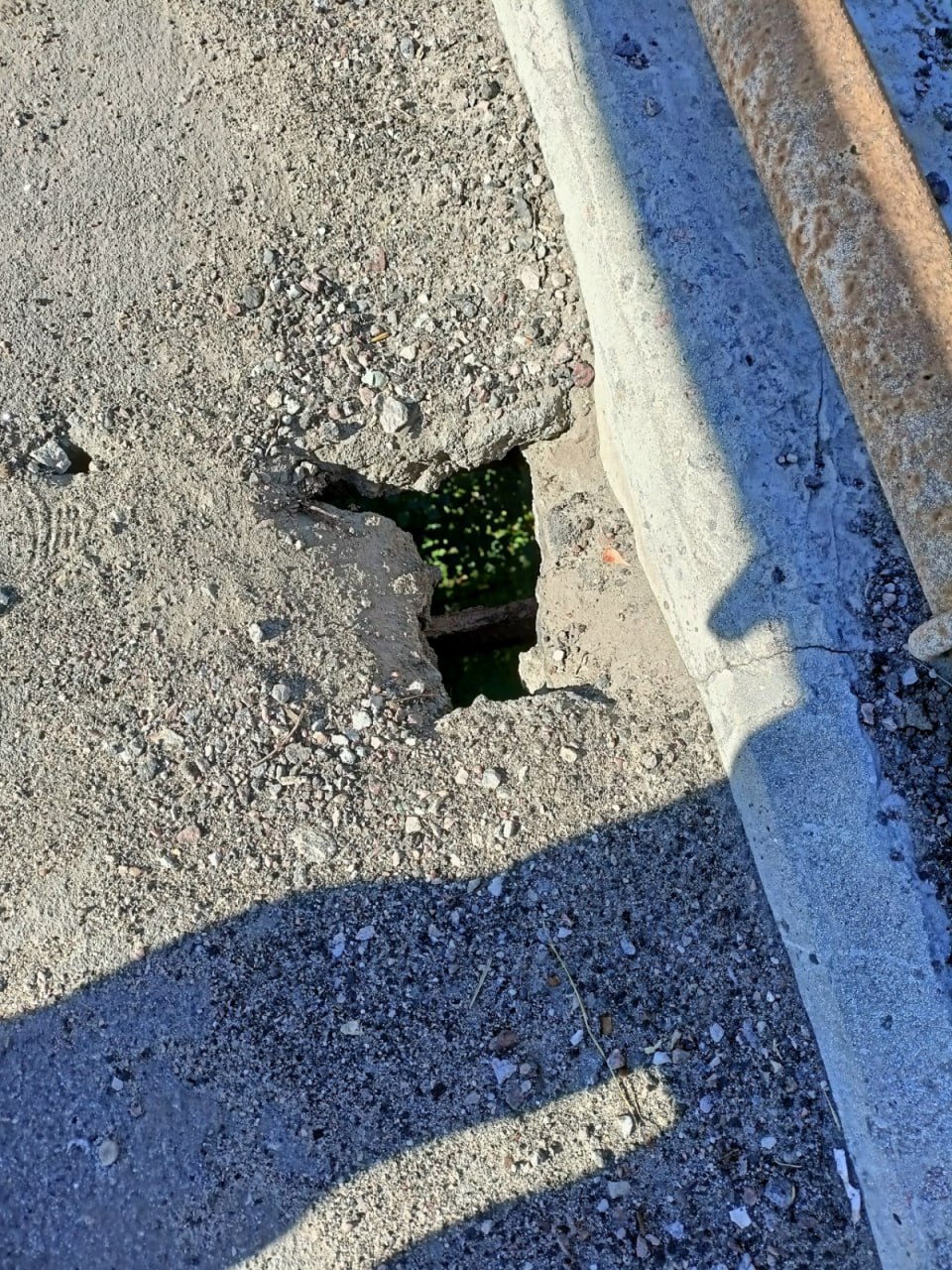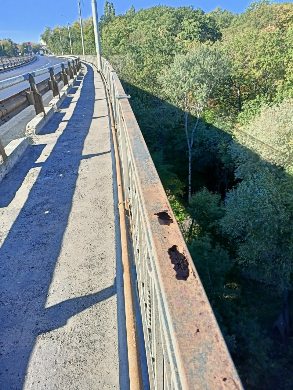 "Мост в никуда в печальном состоянии. Гнилые ограждения, разрушение (причем после очередного ремонта) бетонной части. Сотни и тысячи фур и грузовиков в день, которые по нему проезжают ощутимо его раскачивают (стоять на нем очень чувствительно). Дыры сквозные под ногами"