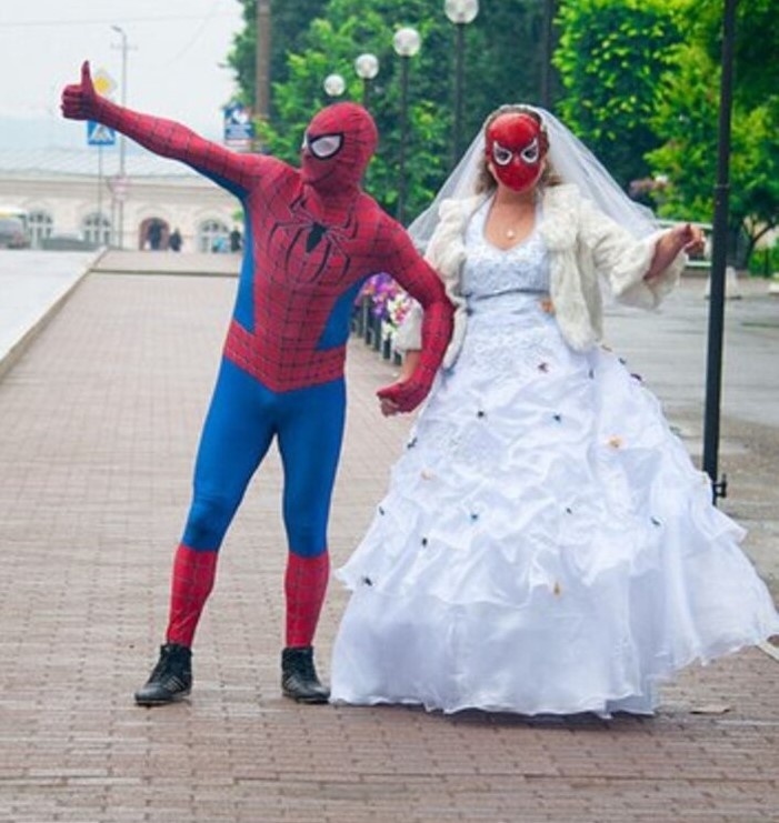 - Вдохновение супергероями. Один жених, будучи ярым фанатом Человека-паука, выбрал костюм в честь своего кумира. Невеста, желая поддержать его выбор, надела маску, создавая эффектную пару, которая точно запомнится всем гостям.