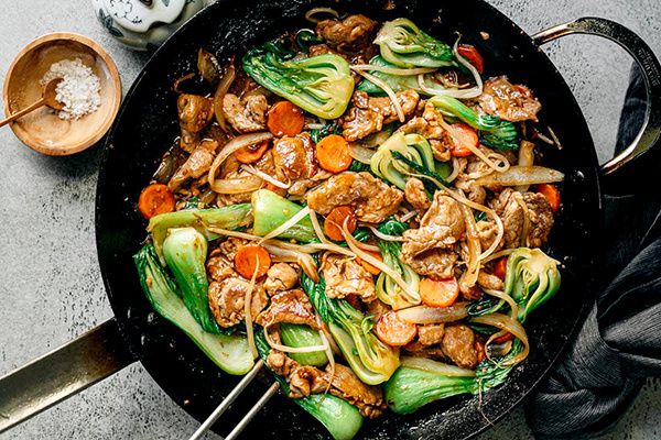 - Приготовление овощей: В той же сковороде жарятся чеснок и лук. Процесс продолжается с добавлением моркови и бок-чой до легкой мягкости овощей.