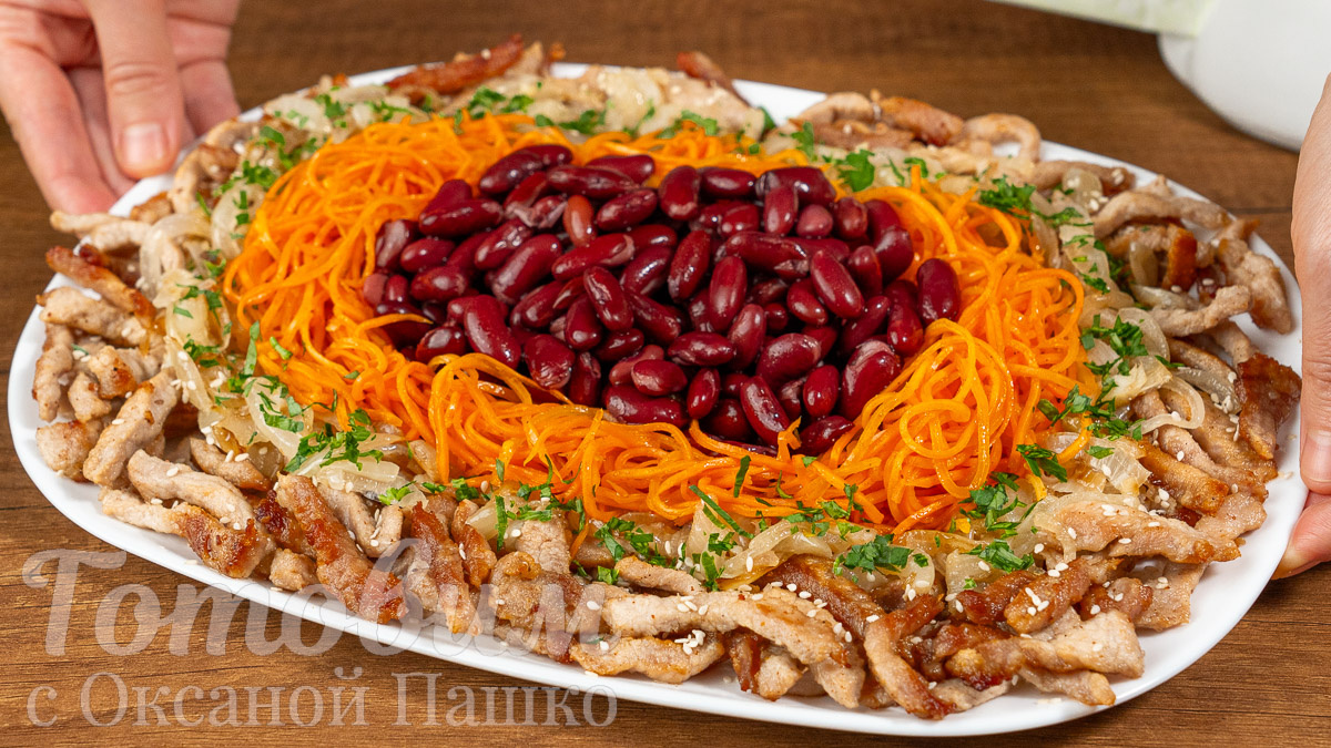 4. Для сборки салата на плоское блюдо выкладывается мясо, обжаренный лук и морковь по-корейски. В центре помещается консервированная фасоль, предварительно промытая под проточной водой. Завершающим аккордом станет посыпка кунжутными семечками и нарезанной петрушкой.