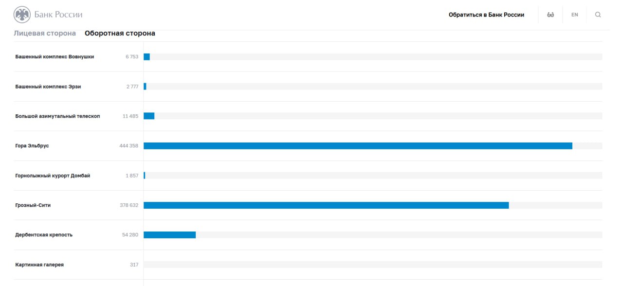 Лидером в промежуточных результатах для лицевой стороны является Академическая (Елизаветинская) галерея, за которую проголосовали 577 тыс человек. Для оборотной стороны – гора Эльбрус, набравшая 442,5 тыс голосов, далее следует Грозный-Сити, за который отдали свои голоса 374 тыс человек.
