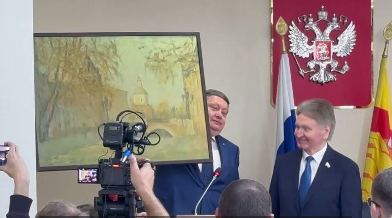 Депутат и ректор ВГАС Александр Сысоев подарил Владимиру Ходыреву картину под названием "Пора собирать урожай"