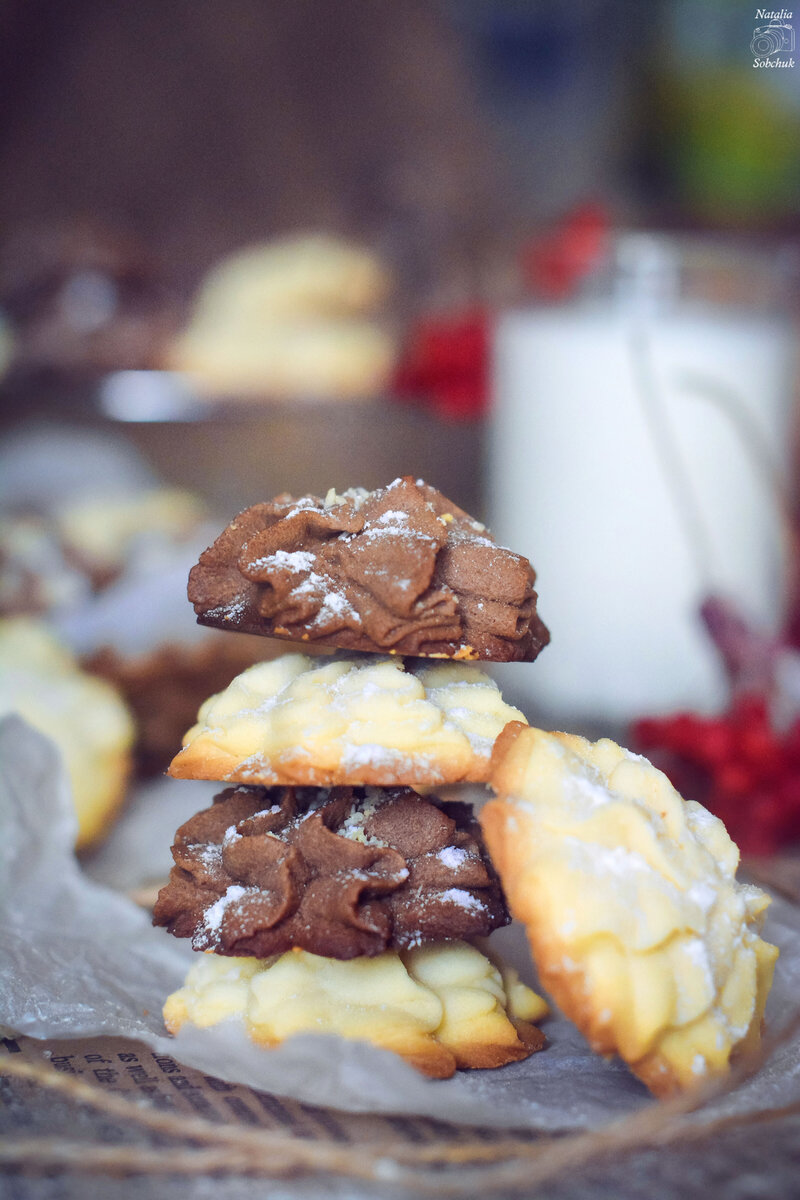 Готовое тесто делится на две равные части. В одну из них добавляется какао, что придаёт необычный оттенок и вкус. Далее обе части помещаются в кондитерский мешок с большой звездчатой насадкой. На противень, предварительно застеленный ковриком, отсаживаются печенья. По желанию можно посыпать их кокосовой стружкой или орехами.