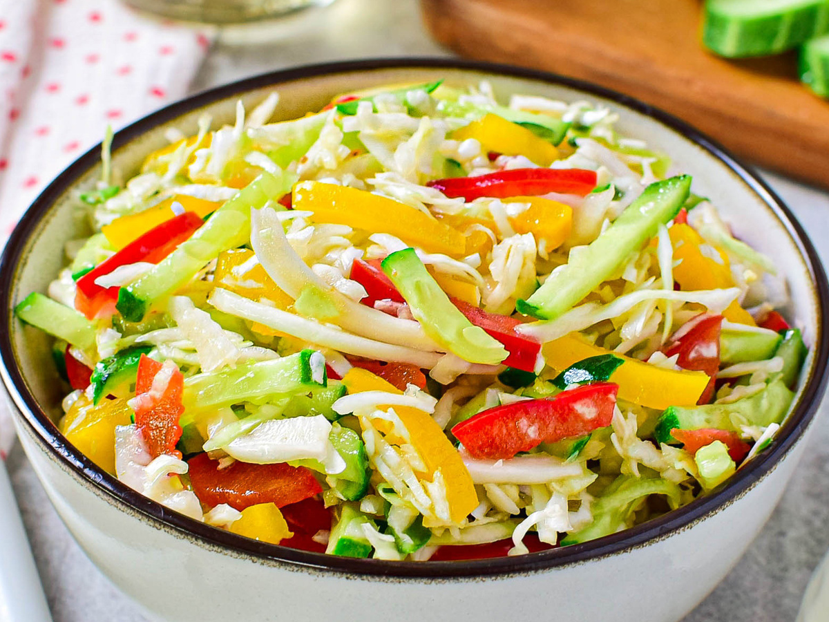 Этот легкий салат готовится за считанные минуты и отлично освежает. Его низкая калорийность (79 кКал) делает его идеальным вариантом для лета. Время приготовления: 15 мин.