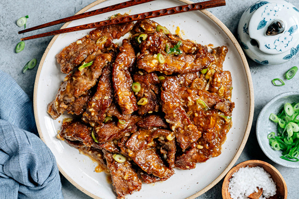 После этого на сковороду добавляют имбирь, чеснок и белые части лука, обжаривают до появления аромата, затем вливают подготовленный соус, помешивают до загустения. В заключение стоит вернуть в сковороду обжаренные кусочки говядины, аккуратно размешать, чтобы каждый кусочек был покрыт ароматным соусом. Блюдо подают горячим, украсив зелёным луком.