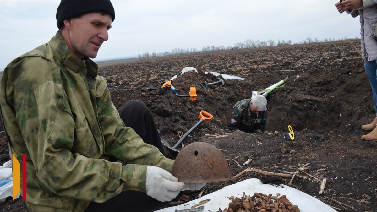Поисковики отряда «Сатурн» поискового объединения «Дон» подняли останки советского и итальянского солдат на высоте 184.2 В ходе разведывательных работ металлоискатель среагировал на советскую каску.
