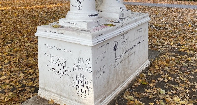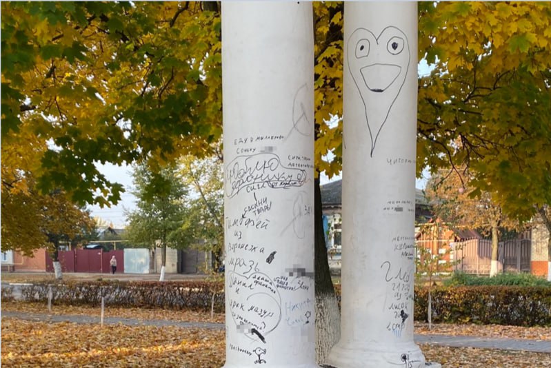Детские художества вышли за рамки баннера. Юные дарования изуродовали колонну поблизости. На элементе благоустройства авторы рисунков оставляли свои имена, телефоны, признания в любви, оскорбления («мразь») и даже использовали ненормативную лексику.