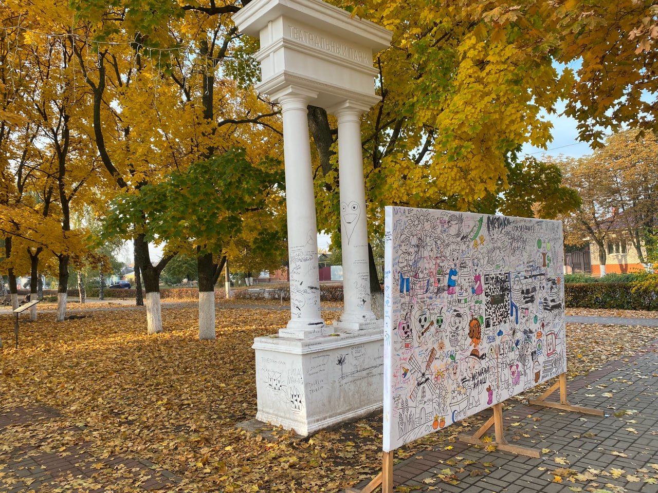 Неизвестные вандалы изуродовали колонну в Борисоглебске. Минувшим летом за драмтеатром появился огромный творческий баннер, который постоянно обновлялся. Юные местные жители с удовольствием его разрисовывали, развивая свой талант.