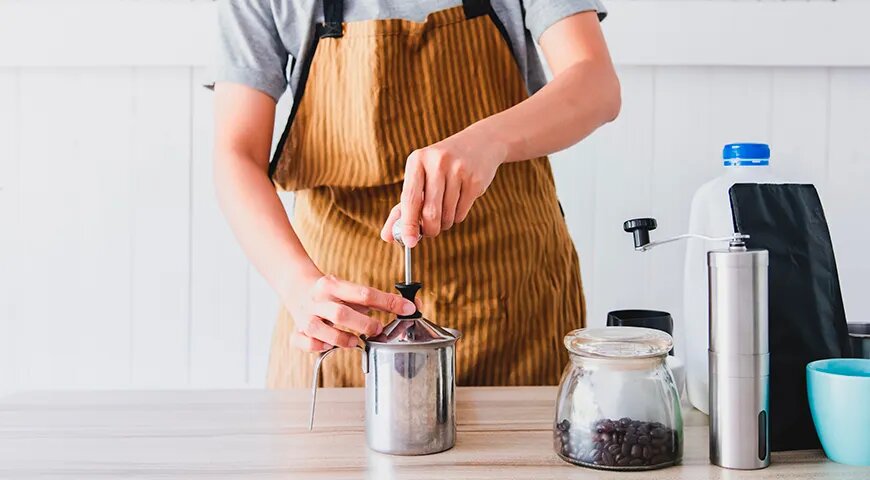 - Френч-пресс: Нагрейте молоко до 60–65°C, налейте его в френч-пресс и энергично двигайте поршень вверх и вниз на протяжении 20–30 секунд. Дайте отдохнуть 10 секунд для стабилизации пузырьков. Если пена получилась слишком воздушной, аккуратно постучите кружкой по столу.