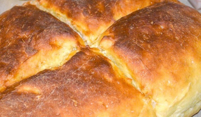 Затем подготовьте противень, смазав его растительным маслом. Сформируйте из теста невысокую лепешку толщиной около 3 см и сделайте на ее поверхности крестообразный надрез. Оставьте хлеб на противне на 90 минут, чтобы он увеличился в объеме.