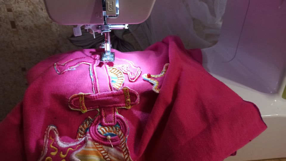 Использование аппликации придало одежде оригинальности и стало достойным украшением, а также сделало изделие более выразительным. Несмотря на сложности, с которыми столкнулась швея — её швейная машина не охотно работала с трикотажом — она смогла преодолеть все трудности. Это именно тот материал, который идеально подошел для комбинезона, обеспечивая максимальный комфорт.