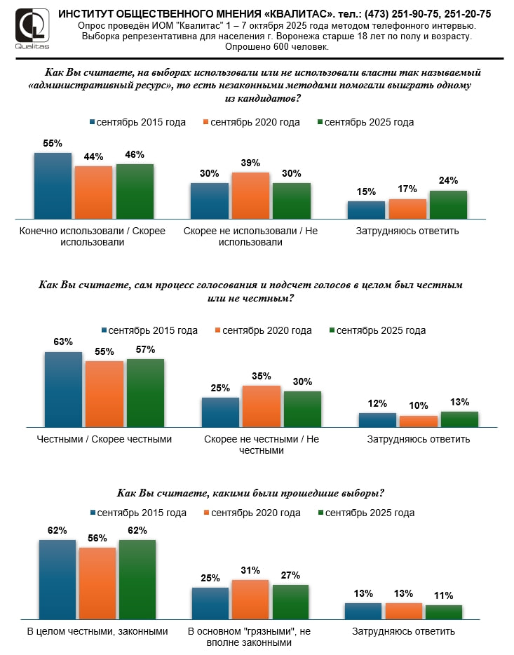 В прозрачности хода голосования и подсчета бюллетеней горожане также начали чуть меньше сомневаться. В 2020 году процесс голосования и подсчета голосов честным называли 55% опрошенных, в 2025 – 57%. Однако доля тех, кто считает, что на прошедших выборах применяли административный ресурс, также выросла на 2 п.п. – 44% до 46%.