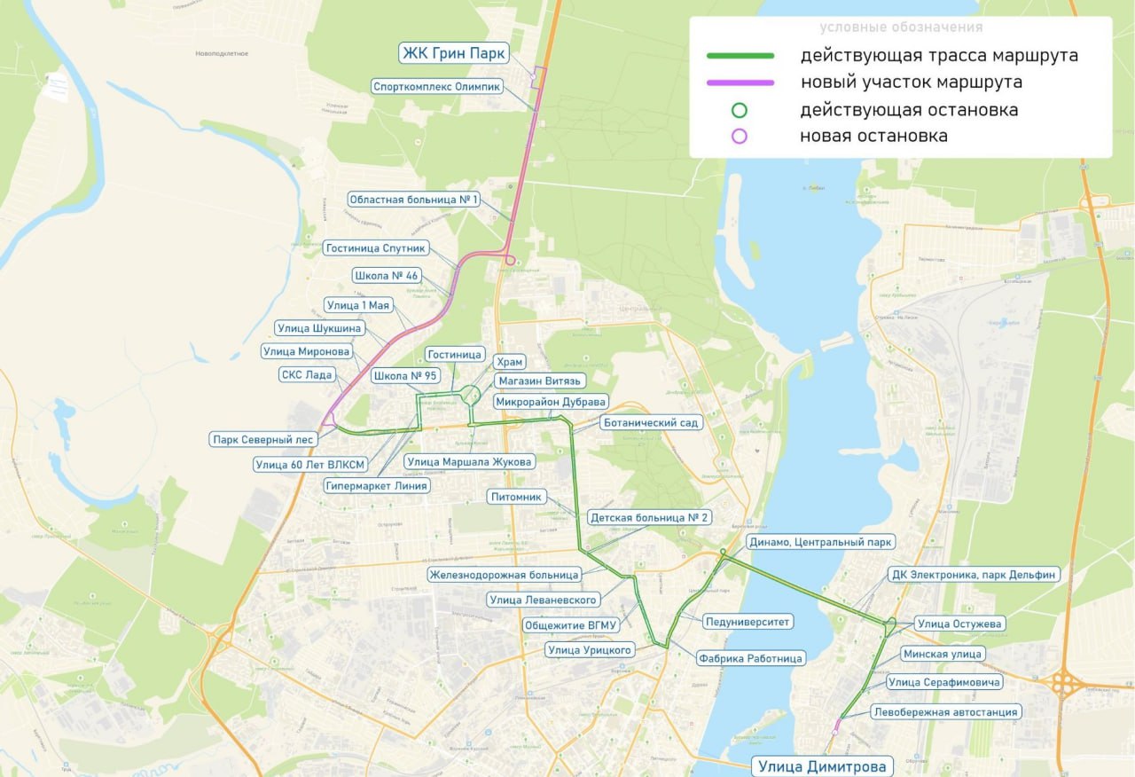 От Северного леса автобусы следуют по улице Антонова-Овсеенко до ЖК «Грин Парк».