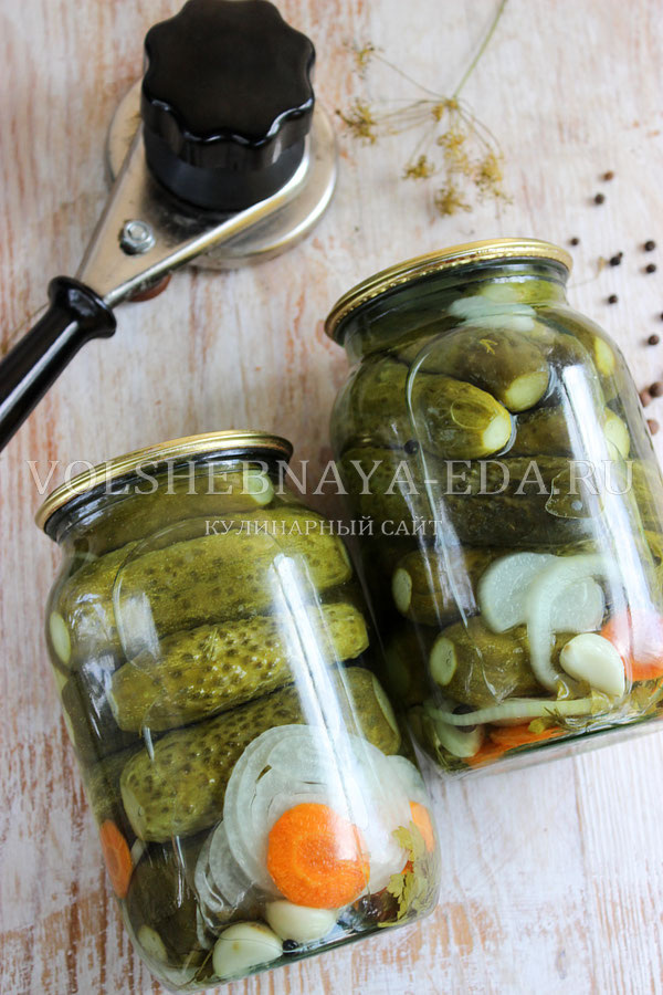 Готовые банки стерилизуют любым удобным способом, будь то микроволновка или духовка. На дно каждой банки укладываются зубчики чеснока, веточки укропа и петрушки, а также колечки моркови и лука. Затем банки заполняют огурцами, стараясь уместить их плотно.