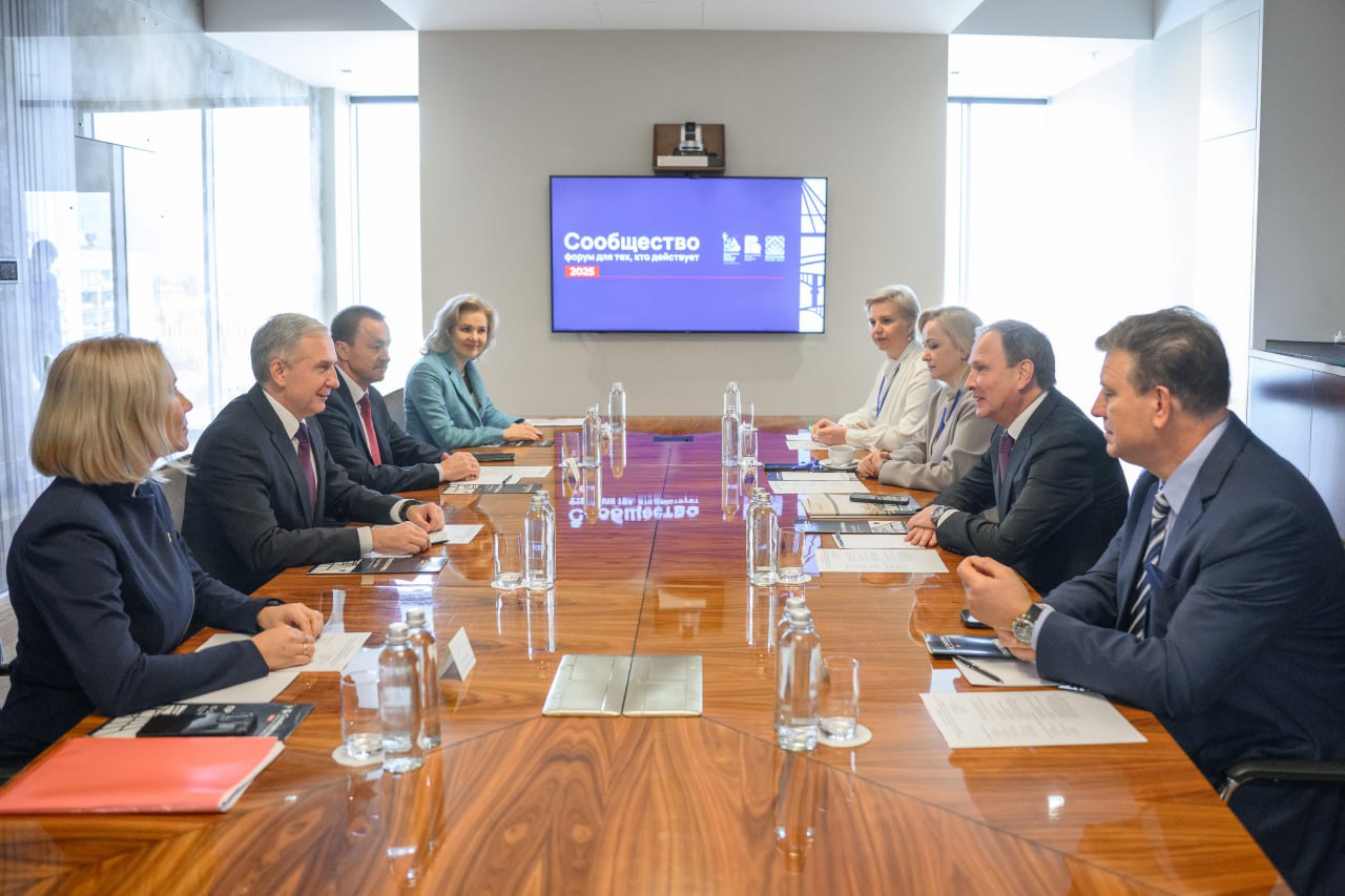 На форуме «Сообщество» в Воронеже врио губернатора Сергей Трухачев встретился с руководителем Комитета семей воинов Отечества Юлией Белеховой и заместителем секретаря Общественной палаты РФ и директором Музея Победы Александром Школьником.